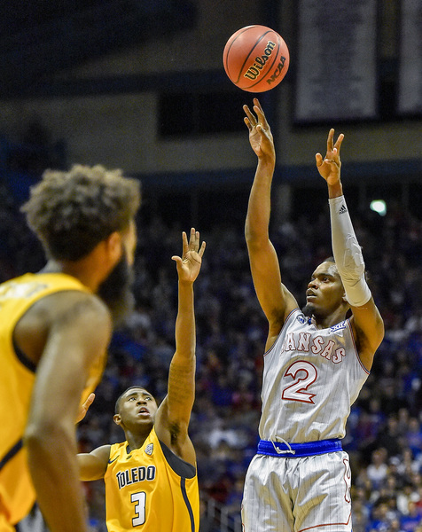 Graham led an offensive attack that accounted for 24 baskets in 32 attempts the first half (39 of 66, .591 for game) for an amazing 75 percent mark. KU hit 9 of 11 3s the first half for 81.8 percent. The Jayhawks finished 12 of 20 from 3. Toledo hit 40 percent of its shots, was 12 of 29 from three and had 20 turnovers to KU's nine.