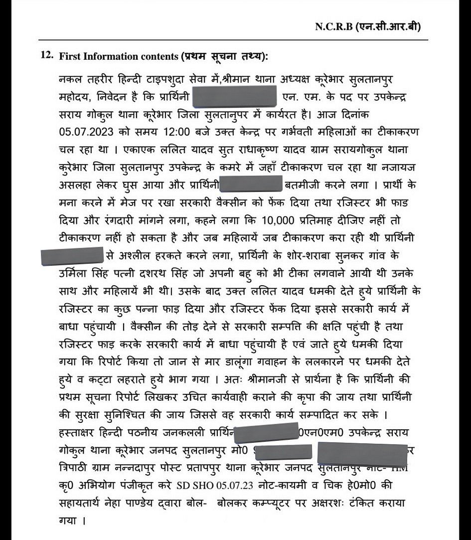 महिला की शिकायत के मुताबिक, ‘स्वास्थ्य केंद्र पर गर्भवती महिलाओं का टीकाकरण चल रहा था. एकाएक ललित यादव उपकेन्द्र के कमरे में जहां टीकाकरण चल रहा था, नजायज असलहा लेकर घुस आया और बदतमीजी करने लगा. उसने मेज पर रखी सरकारी वैक्सीन को फेंक दिया और रजिस्टर भी फाड़ दिया. वह रंगदारी मांगने लगा और कहने लगा कि 10,000 प्रतिमाह दीजिए नहीं तो टीकाकरण नहीं हो सकता है. इस दौरान वह एएनएम से अश्लील हरकते करने लगा. जिसके बाद शोर-शराबा सुनकर और लोग भी वहां आ गए. इसके बाद ललित यादव धमकी देते हुए और कट्टा लहराते हुए वहां से भाग गया.’