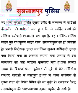 दरअसल, सुलतानपुर पुलिस ने बताया कि ललित यादव बतौर पत्रकार ये वीडियो बना रहा था जबकि वह पत्रकार नहीं है और साथ ही उस पर पहले भी गंभीर धाराओं में दो मामले दर्ज हैं. इतना ही नहीं पुलिस ने ये भी बताया कि महिला स्वास्थ्यकर्मी ने उसके खिलाफ तहरीर भी दी है. जिसके बाद आगे की कार्यवाही की जा रही है.