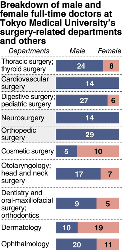 According to the Health, Labor and Welfare Ministry, the percentage of female doctors nationwide -- including those working part-time -- at the end of 2014 was 20.4 percent. By departments, women accounted for 46.1 percent of doctors in dermatology and 37.9 percent in ophthalmology. However, the figures nosedive in surgery-related departments, such as 5.2 percent in neurosurgery and 4.6 percent in orthopedic surgery.