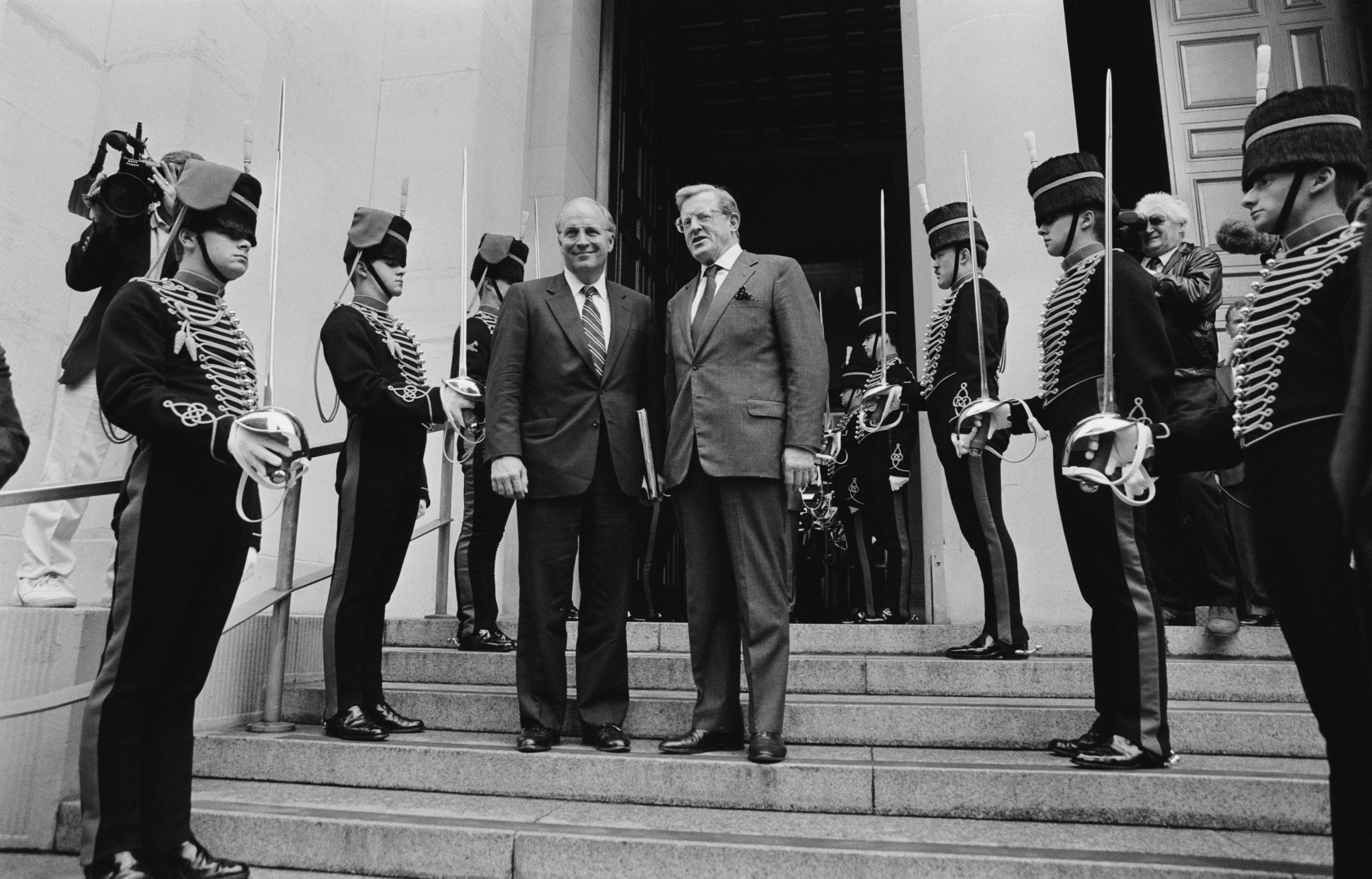 Defense Secretary Cheney visits with U.K. Defense Secretary Tom King in October 1990. Photo: Peter Macdiarmid/Getty Images