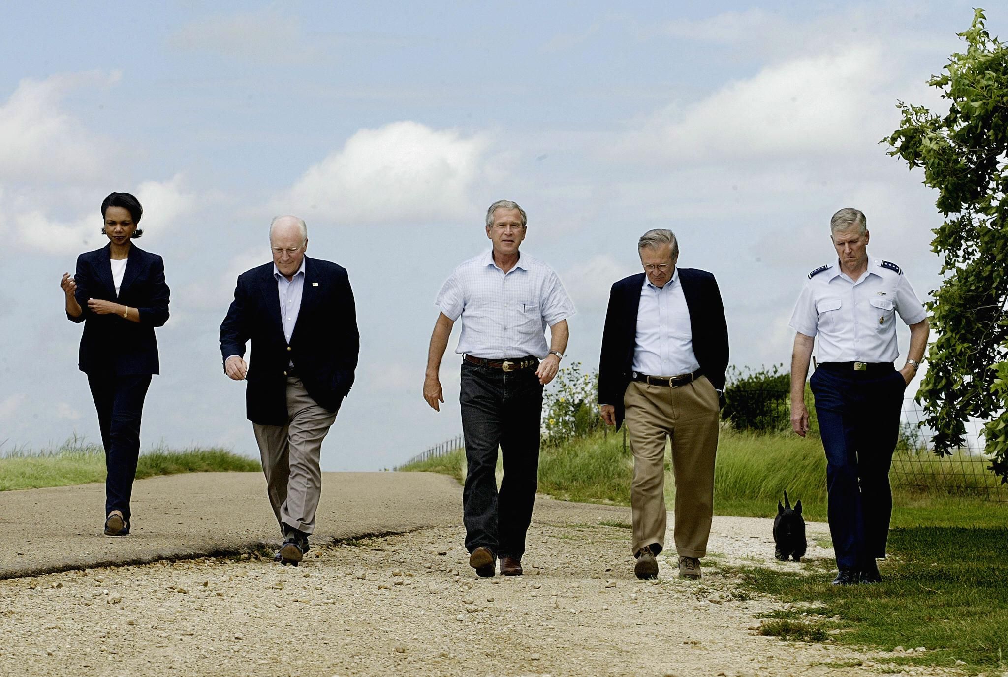 President Bush, Vice President Cheney and other members of the Bush team walk out to address reporters in August 2004 at Bush's Texas ranch. Photo: Luke Frazza/AFP via Getty Images