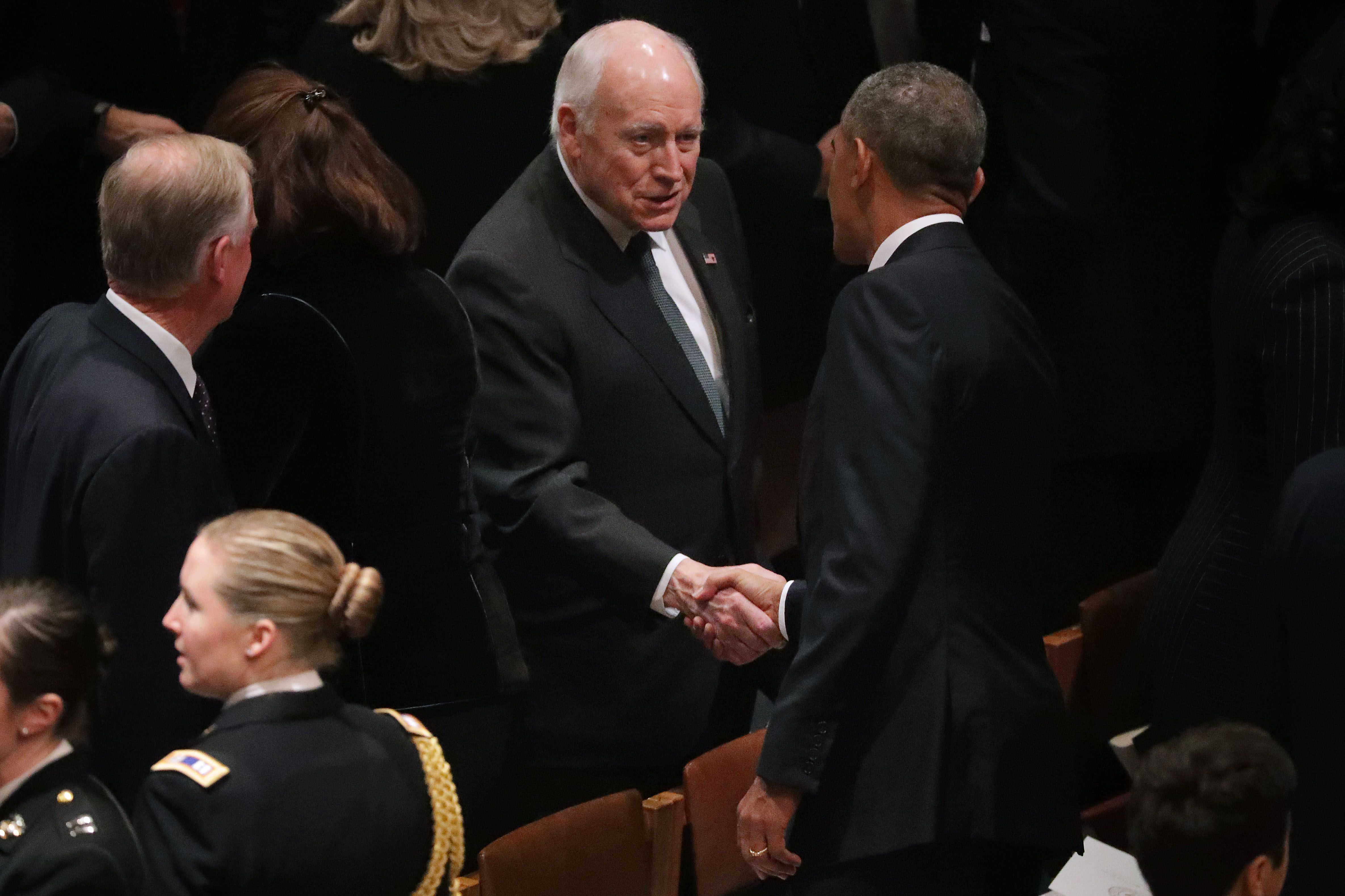 Cheney greets former President Obama during the state funeral for former President George H.W. Bush at the National Cathedral Dec. 5, 2018. Photo: Chip Somodevilla/Getty Images