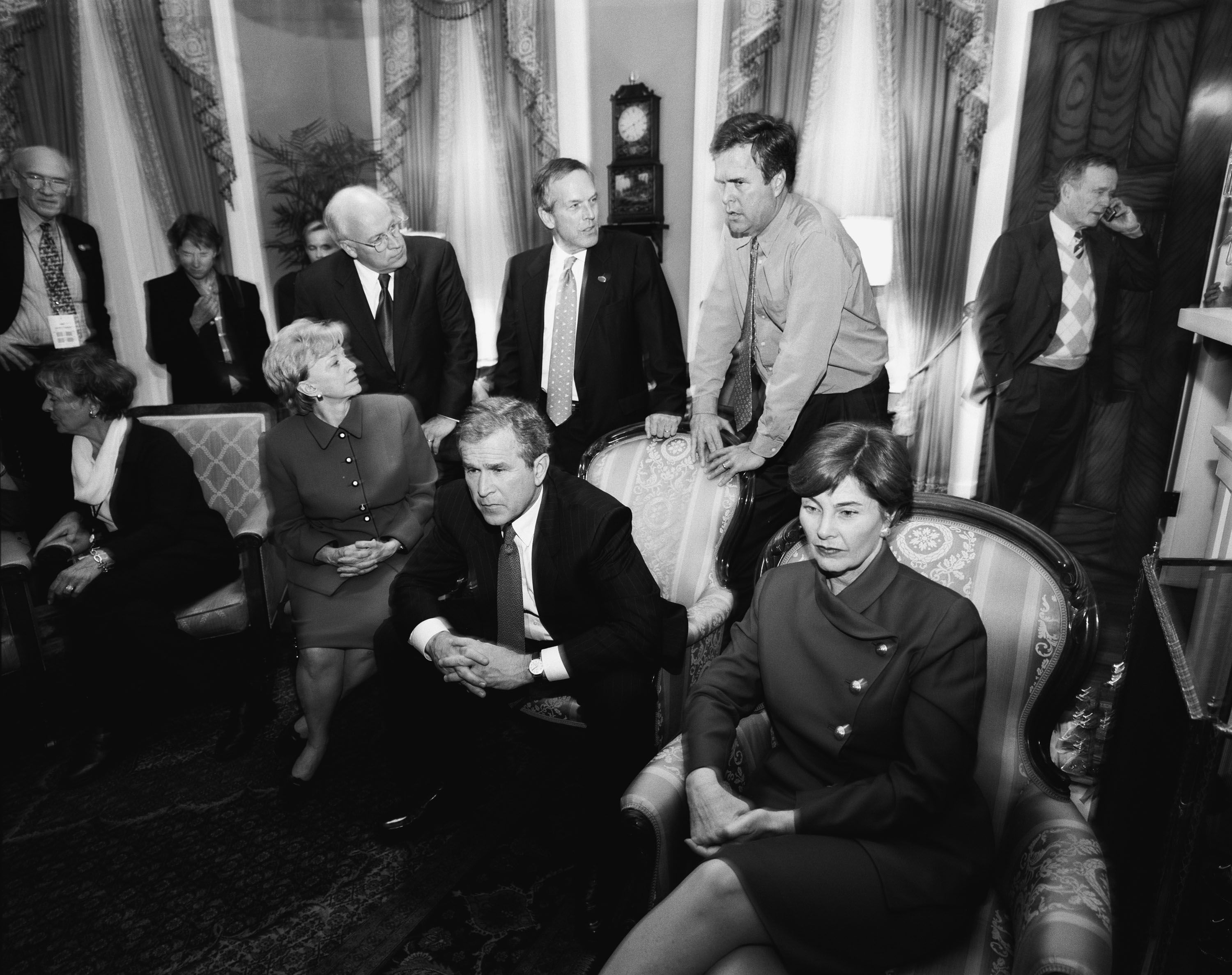 Bush, the Republican presidential nominee, Laura Bush, Lynne Cheney, VP nominee Cheney, Gov. Jeb Bush, and campaign chair Don Evans at the governor's mansion in Austin, Texas, Nov. 8, 2000, watching returns. Photo: David Hume Kennerly/Getty Images