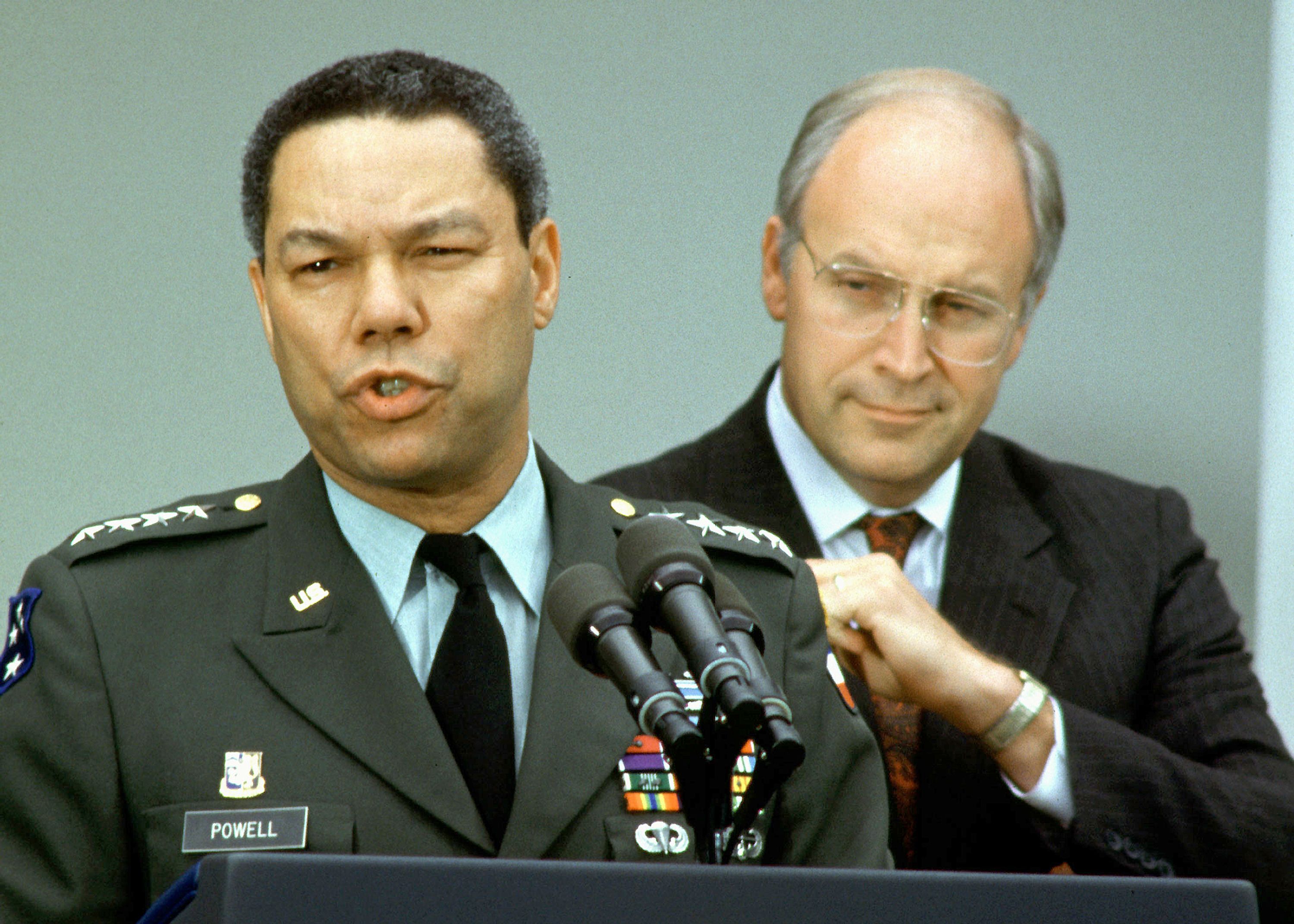 U.S. Army General Colin Powell speaks in the Rose Garden on Aug. 10, 1989. He had just been named chairman of the joint chiefs of staff. Behind him is Defense Secretary Cheney. Photo: Ron Sachs/CNP/Getty Images
