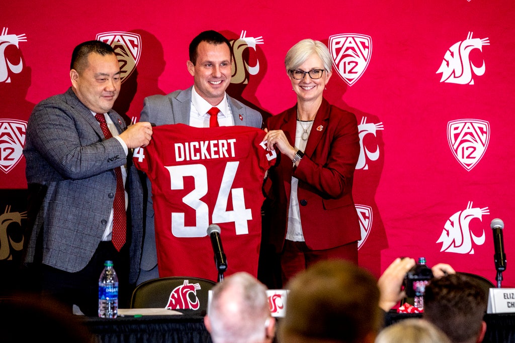 Jake Dickert was introduced Thursday as the new head football coach at Washington State and vowed to “bring the Pac-12 championship back here to Pullman, Washington.”