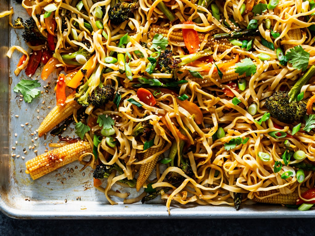 Remove the baking tray from the oven and push the vegetables to one side. Add the noodles, corn and asparagus to the other side. Drizzle just the noodle mixture with olive oil, lightly season with salt and toss well to coat. Return the tray to the oven and continue to roast for 15 to 18 minutes, or until the noodles are crispy on the top and bottom – you are looking for a combination of crispy and non-crispy noodles.