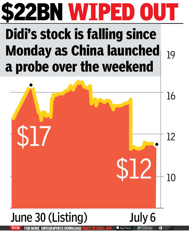 NEW DELHI: Didi Global plunged on Tuesday in US trading as the ride-hailing company faced scrutiny over its data security and a broader Chinese crackdown on companies listing their shares abroad.