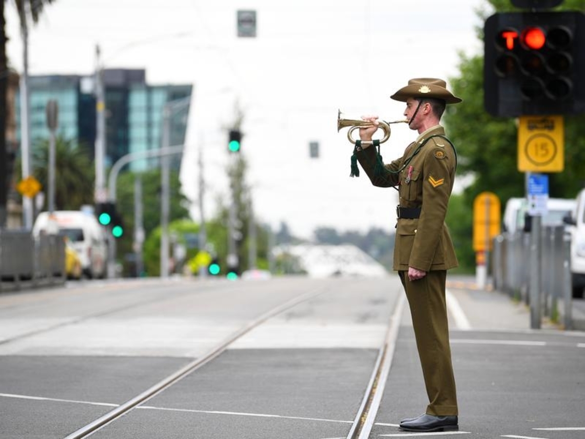 In Victoria, with only 10 people allowed to congregate at memorials and local cenotaphs, the traditional ceremony at Melbourne's Shrine of Remembrance was closed to the public but went ahead as a virtual presentation.