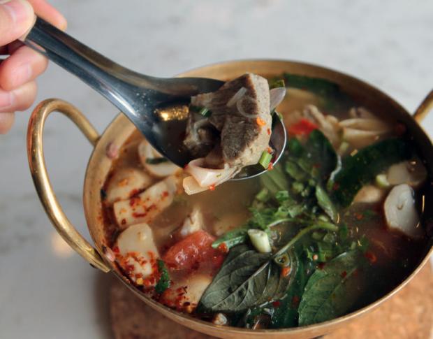 Tom sab kraduk on, or sour and spicy soup of young pork spareribs and herbs (119 baht), served in a brass pot over flame, was deliciously soothing.