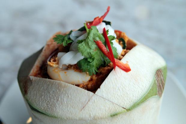For entrées to eat with rice (15 baht per portion), you won't regret having hor mhok thalay maphrao on, or steamed seafood curry pudding with young coconut flesh (229 baht). Immersed in the velvety custard-like pudding inside a whole coconut were squid, prawn, crab and mussels -- all of top quality.