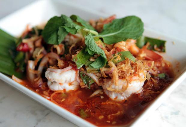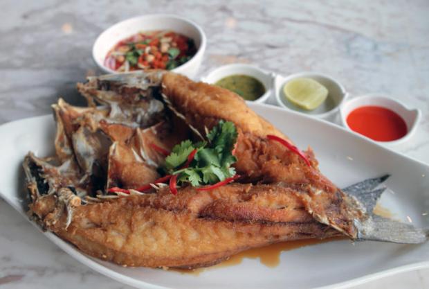 Served in baskets, moo sam chan thord nam pla, or crispy slices of pork belly seasoned with fish sauce (119 baht), and deep-fried salmon belly (149 baht) also proved worthy starters.