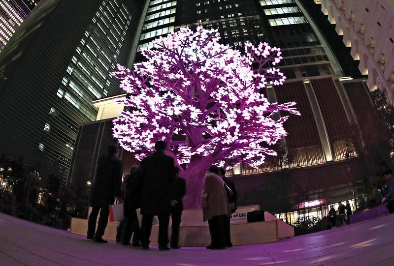 An event in which an art installation uses LED lights to imitate cherry blossoms and restaurants offer dishes on the same theme started Friday in the Nihonbashi district of Chuo Ward, Tokyo.