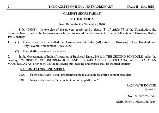 The order, which was signed by president Ram Nath Kovind on November 9, officially brings digital media under the I&B ministry. For this purpose, the order noted, the Government of India Allocation of Business Rules, 1961, was amended. The rules will now include "films and audio-visual programmes made available by online content providers", and "news and current affairs content on online platforms”.