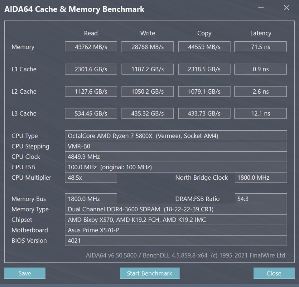 Below, you can see the AIDA64 benchmark results for the (thankfully) dual-channel memory: