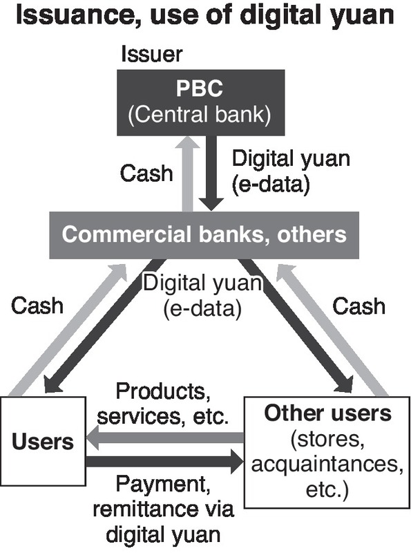 Digital yuan are to be supplied through a "two-layer structure" mediated by commercial banks. If the central bank provided digital yuan directly to users without going through commercial banks, financial intermediary functions such as bank financing would weaken, having a negative impact on the economy.
