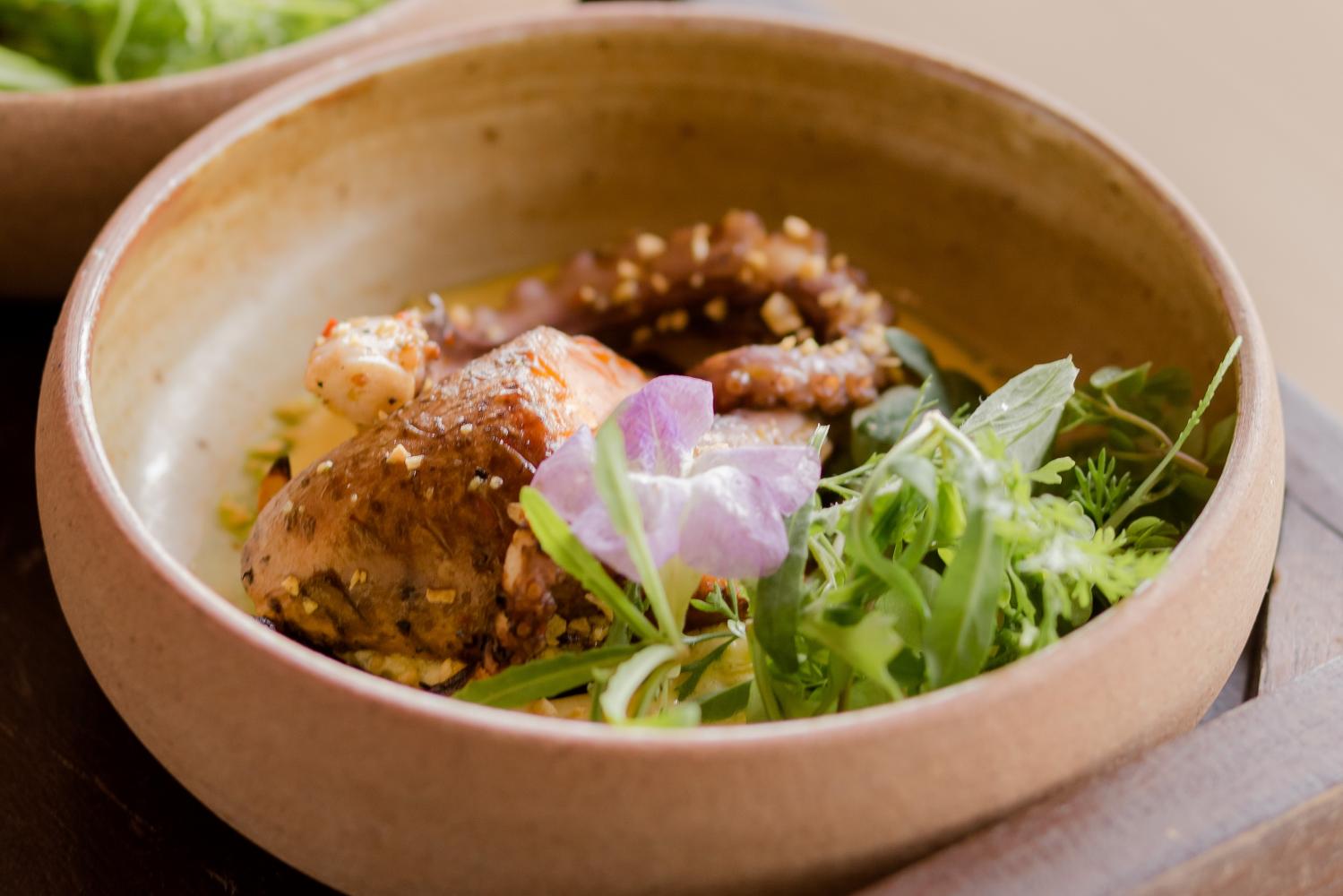 "All the young leaves from herbs and salads grown on the farm make up the salad, which changes daily depending on what leaves the farm supplies the kitchen with. Usually its young kale, baby spinach, some winged beans," adds the chef. The octopus is finished with a gremolata (350 baht).