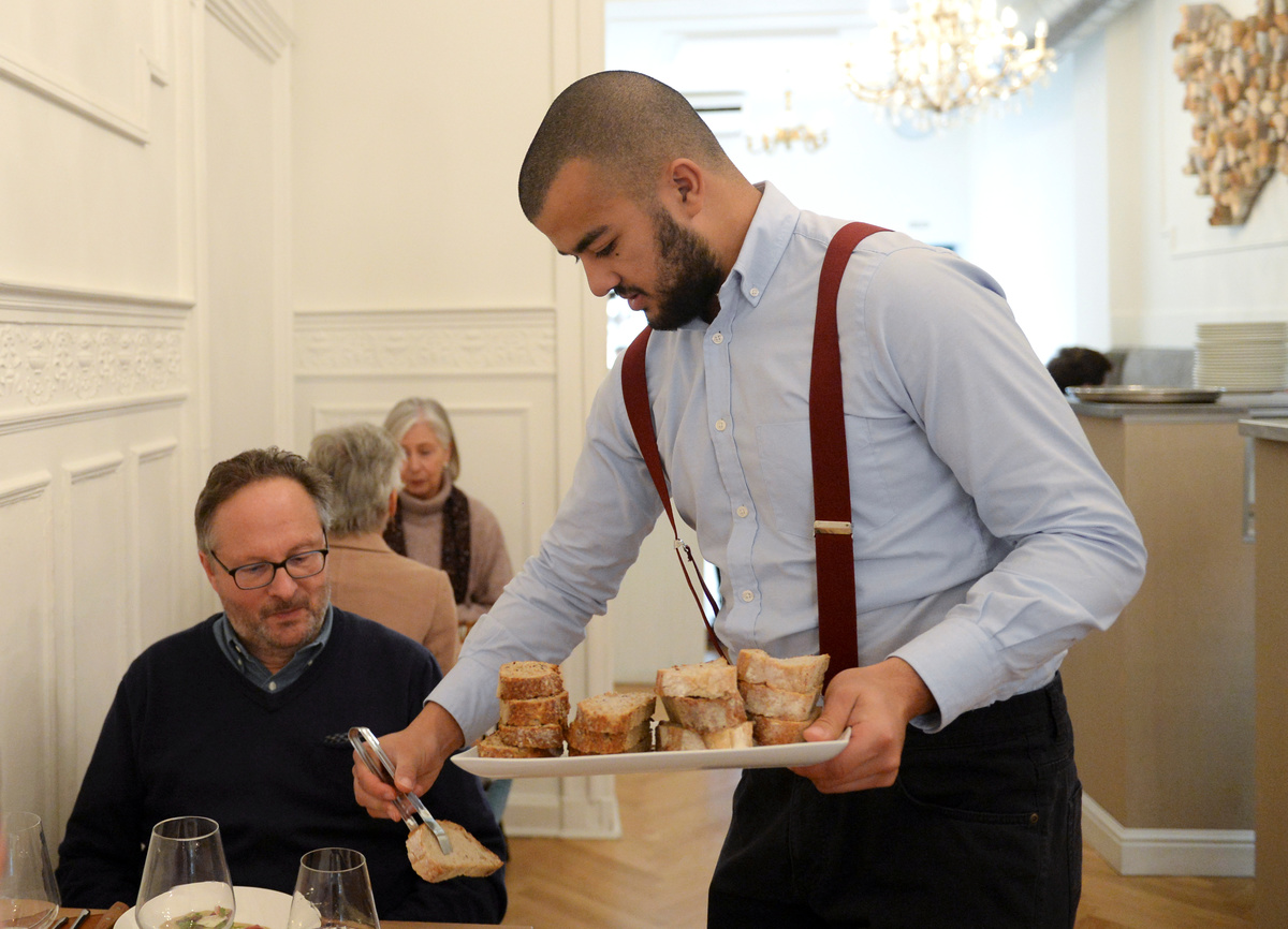 Salim Boughriff, a server at the Belgian restaurant "65 degres" serves a customer at the restaurant in Brussels, Belgium November 22, 2019. REUTERS/Johanna Geron