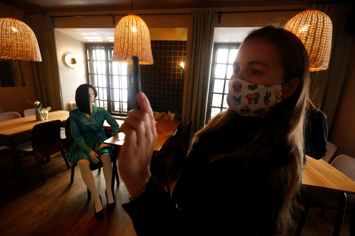 A woman wearing a protective face mask takes a picture of a mannequin inside a restaurant where mannequins dressed in creations of local designer sit at the table and bar, during the coronavirus disease (COVID-19) outbreak in Vilnius, Lithuania, May 21, 2020. REUTERS/Ints Kalnins