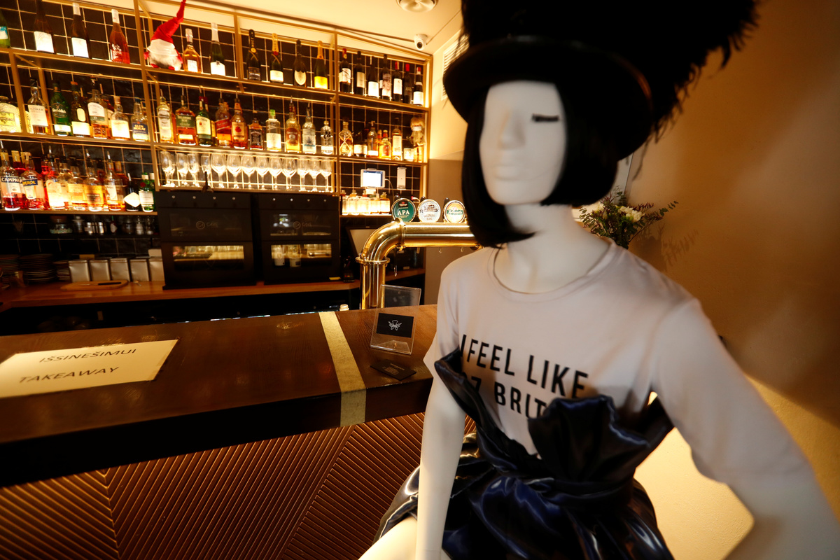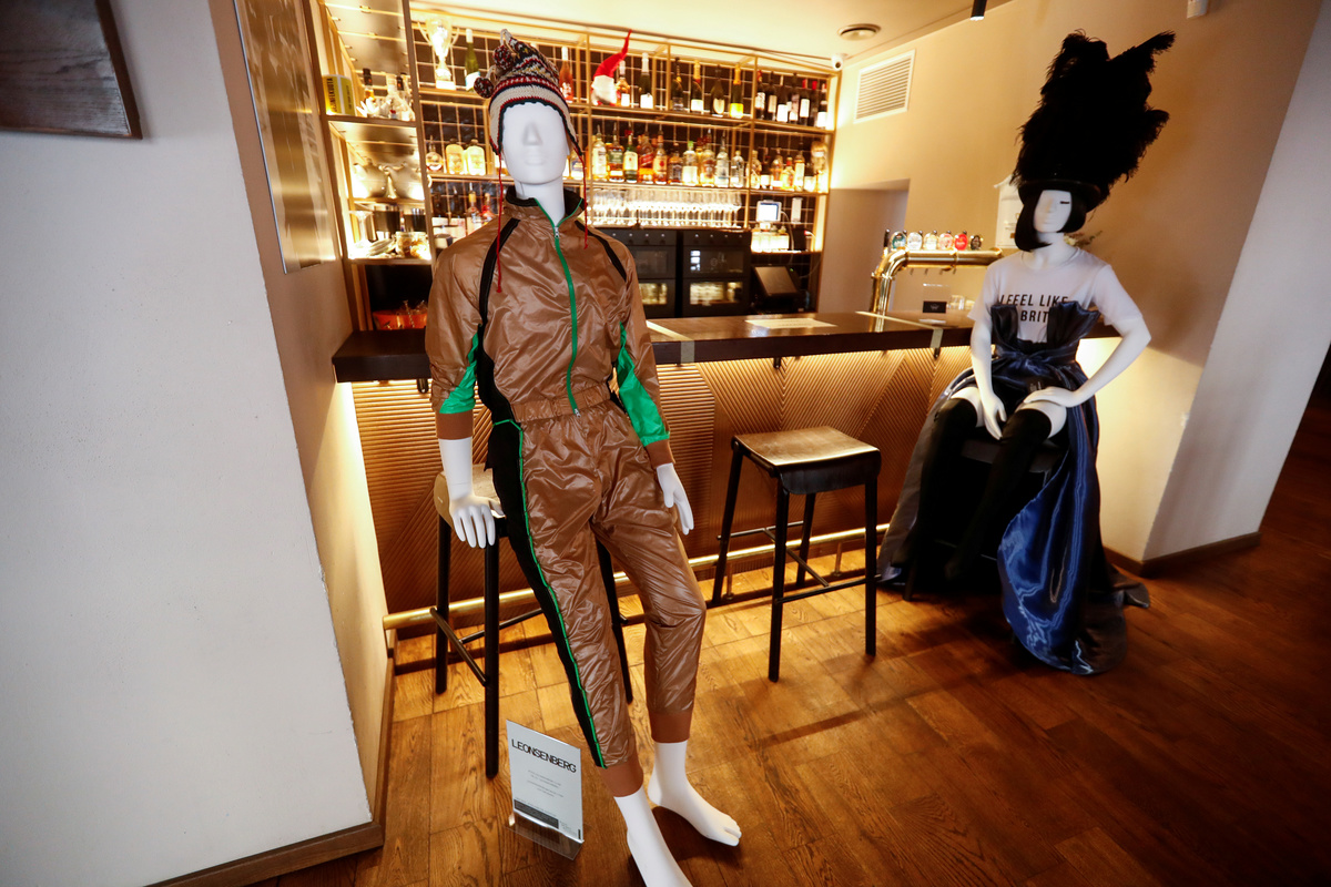 A mannequin dressed in creations of local designer sits at the bar in a restaurant during the coronavirus disease (COVID-19) outbreak in Vilnius, Lithuania, May 21, 2020. REUTERS/Ints Kalnins
