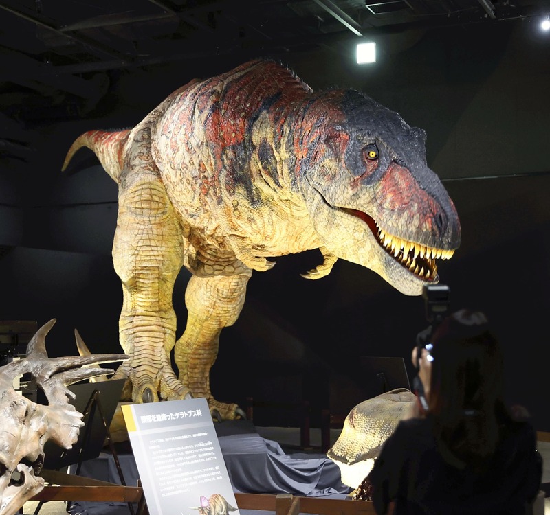 A life-size Tyrannosaurus rex robot menaces in Tokyo Dome City's Gallery AaMo in Bunkyo Ward, Tokyo as part of Dinosaur Exhibition 2021. The event opened Saturday with 26 different fossil specimens, including the complete skeletons of large carnivores and the skull of a long-horned beast. Visitors can also watch a spectacular digital dinosaur battle shown on a big screen. The exhibition is scheduled to run through Sept. 5 but is subject to change due to the novel coronavirus.