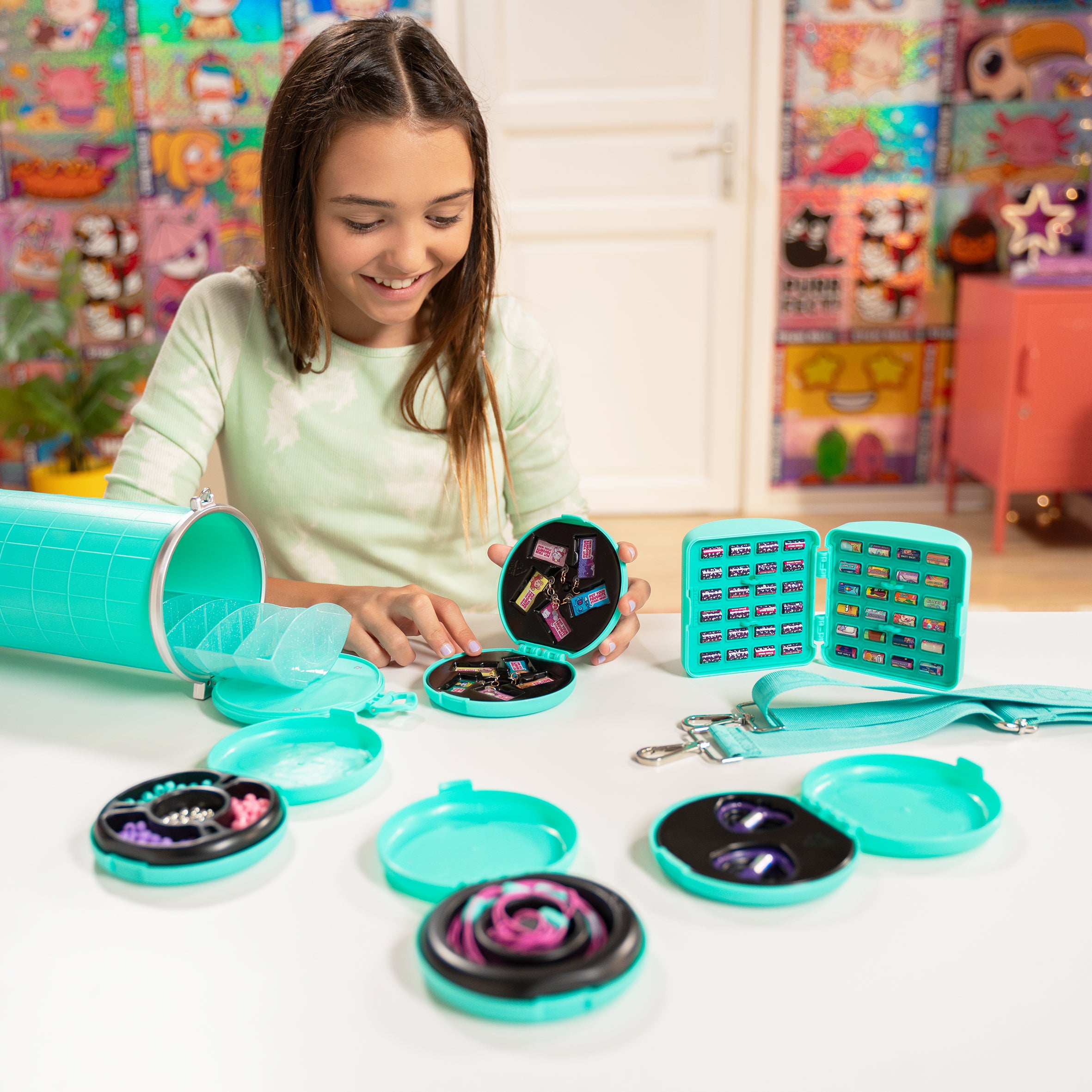 This is a glam shoulder bag sticker station to hold all kids’ favourite Sticki Rolls and accessories. It includes 50 Sticki Rolls featuring 500 unique, Kawaii-themed stickers, three Jumbo holographic Stickis, and enough supplies to make 10 bracelets and two pendants.