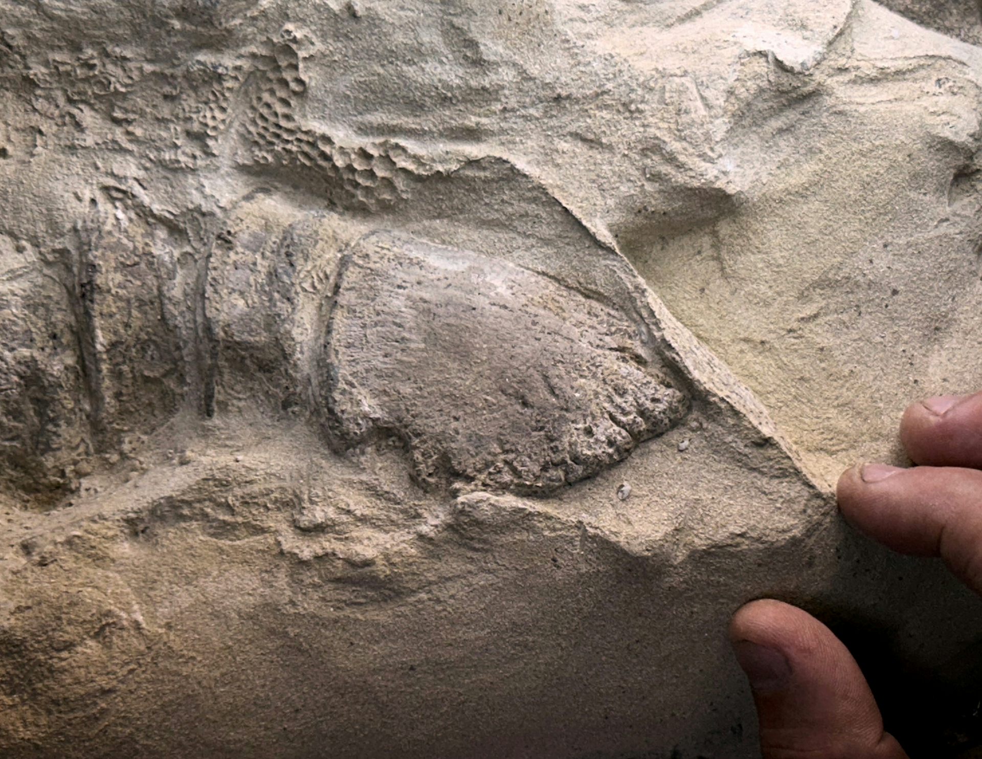 We used a diamond blade to section the skin, spikes and hooves, and found that all were made of a very thin bounding layer of clay – a clay mask or template – one-hundredth of an inch (less than 1 millimeter) thick. The sand on both sides of the clay layer was indistinguishable, suggesting that when the carcass was buried, the same sand that pressed against the outside also entered the dried, hollowed carcass through many cracks and holes, filling all of the internal spaces. Even the spaces inside the spikes and hooves were sand-filled.