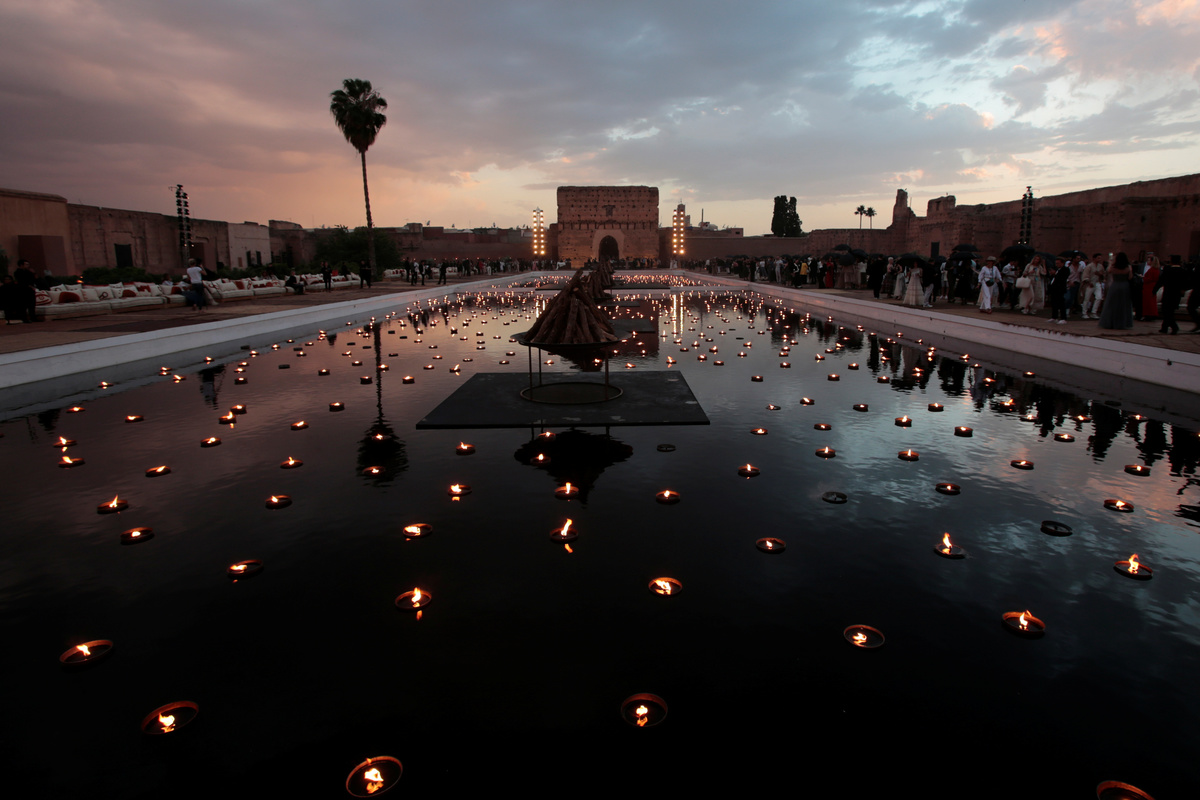 As night fell over the city's 16th century El Badi Palace and its pool and gardens, models - some wearing bandanas - showcased flowing gowns in maroon or black alongside patterned styles in fabrics from Ivory Coast, fashioned into the brand's trademark synched suit jackets.