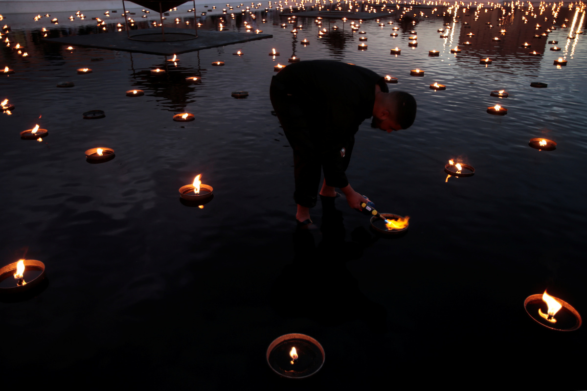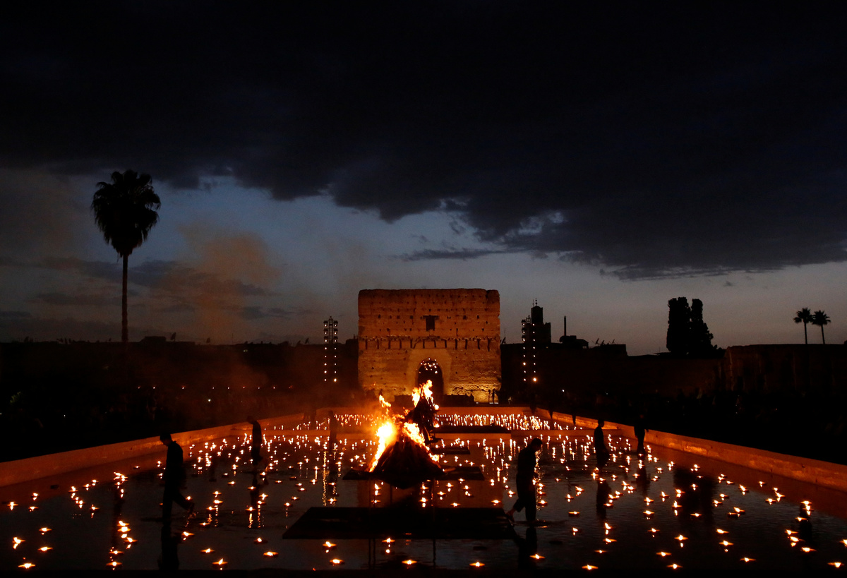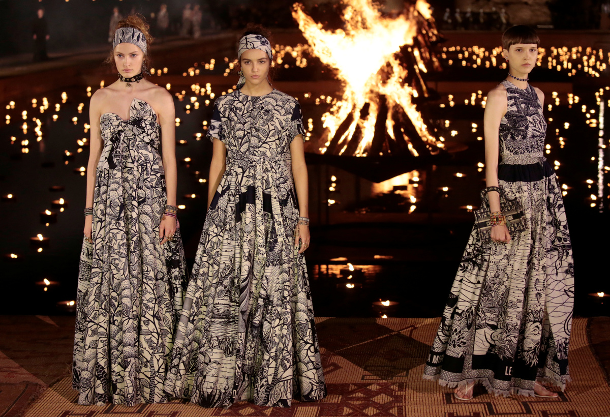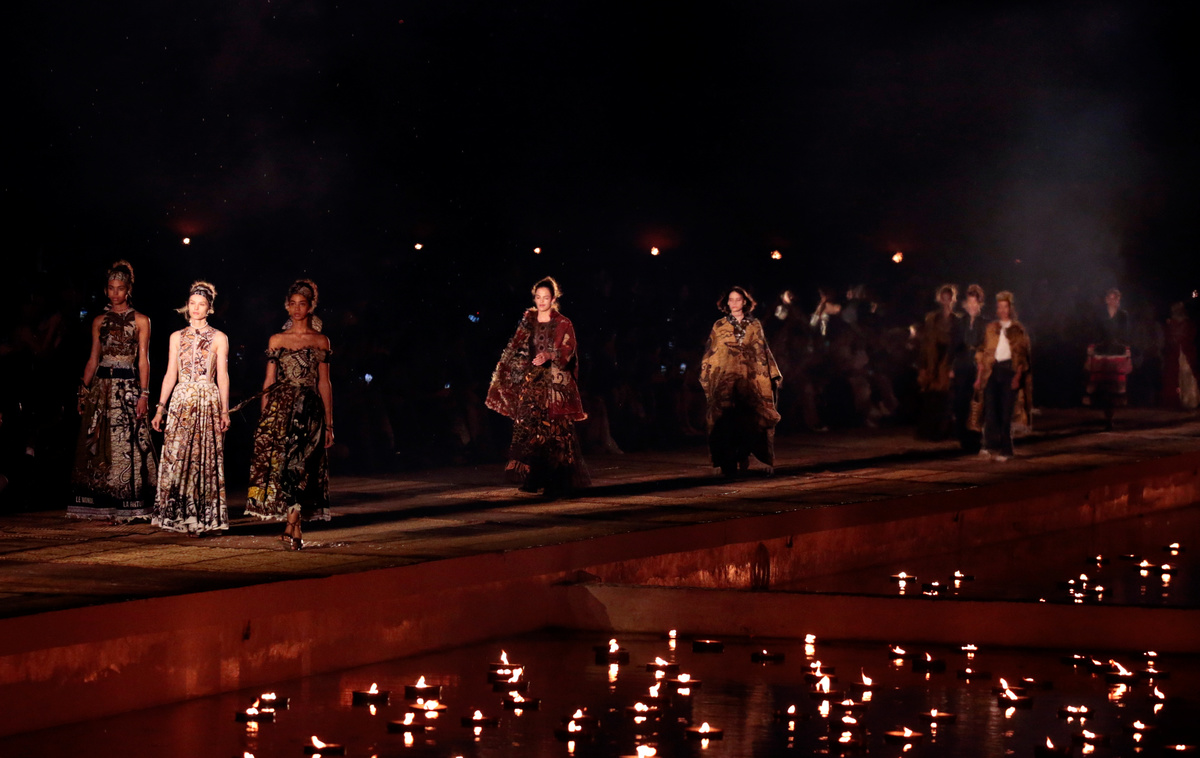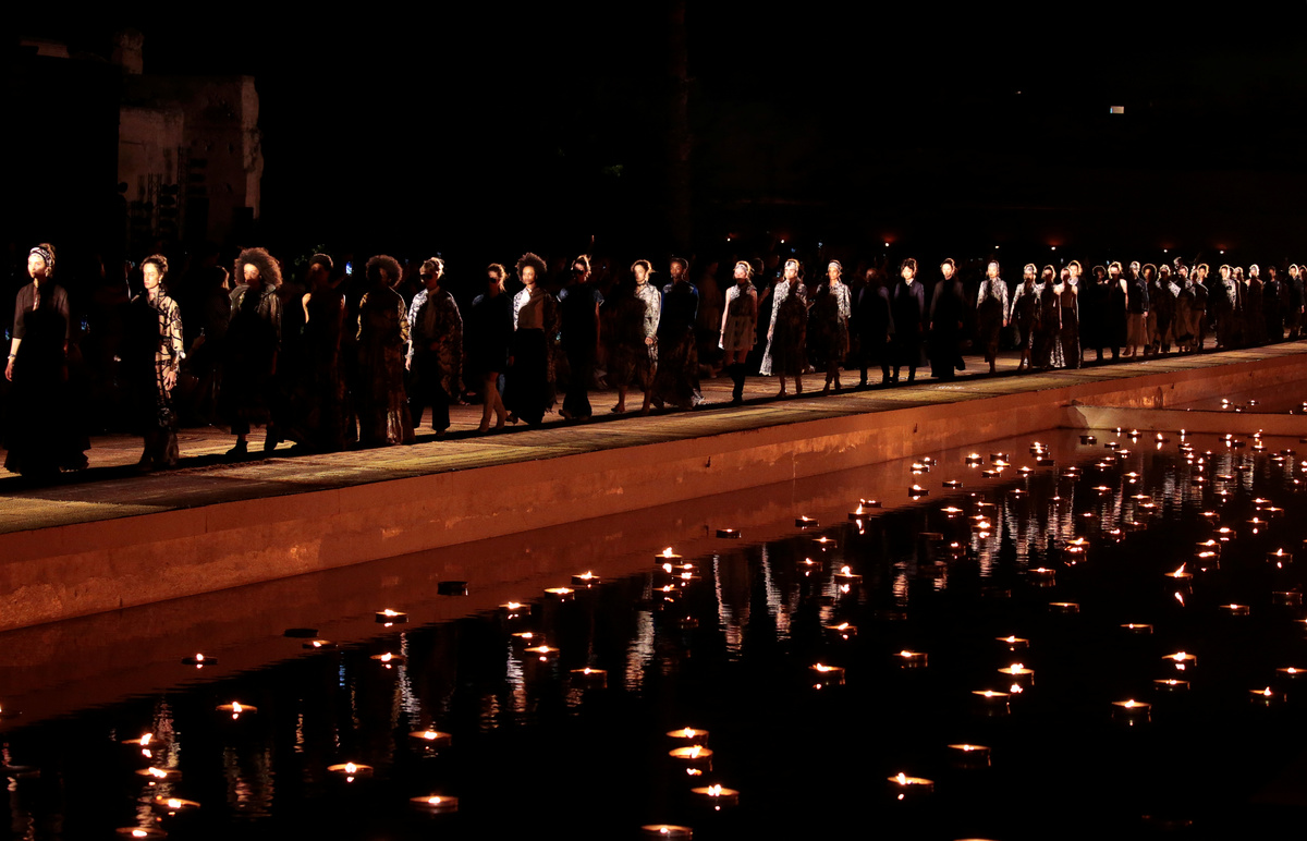 MARRAKECH, Morocco (Reuters) - Around an enormous outdoor runway lit with dozens of floating tealights, French label Christian Dior crisscrossed cultures and continents at its first fashion show in Morocco on Monday, with beaded dresses and patterned prints taking center stage.