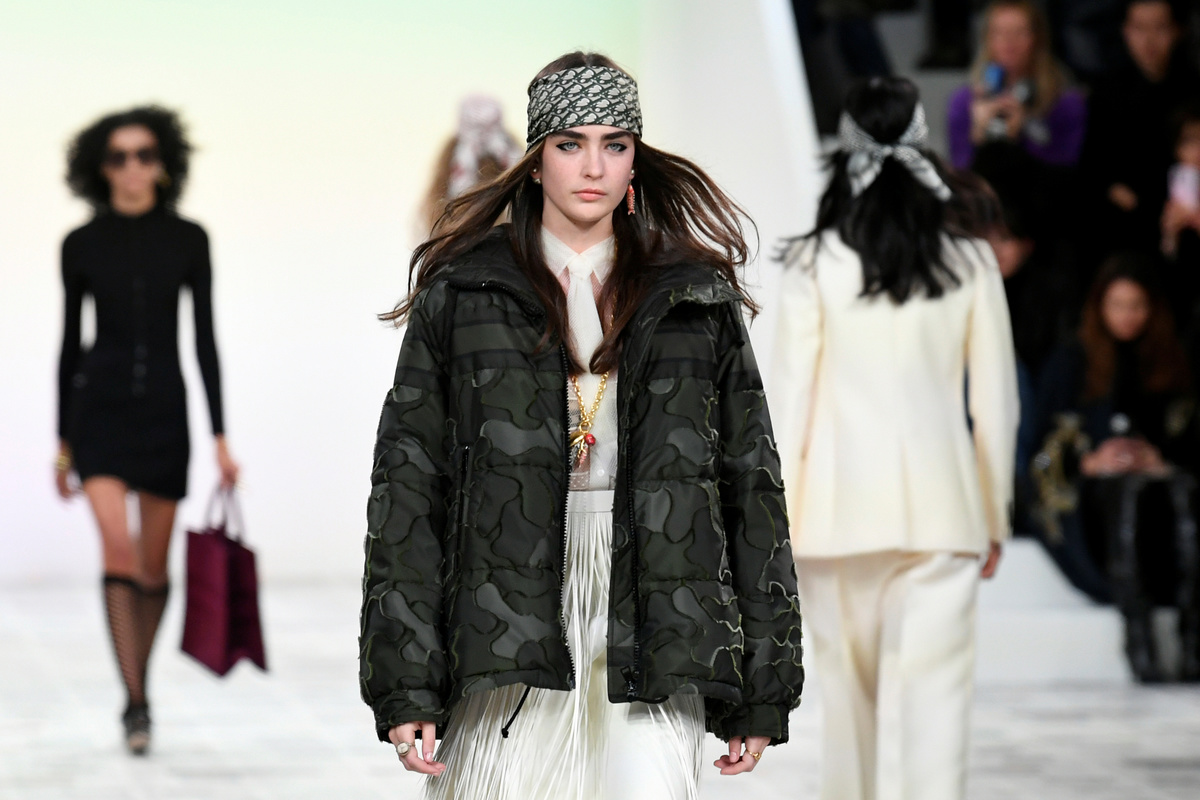 Some looks seemed inspired directly by Chiuri's own experiences, including a camouflage-style puffer jacket.