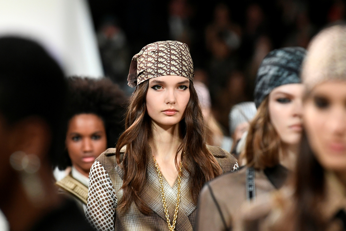 Models wearing headscarves showcased pieces in chequered prints and plenty of fringes, while the designer also explored feminist references that first inspired her, and which have become a recurrent theme for the LVMH-owned brand.