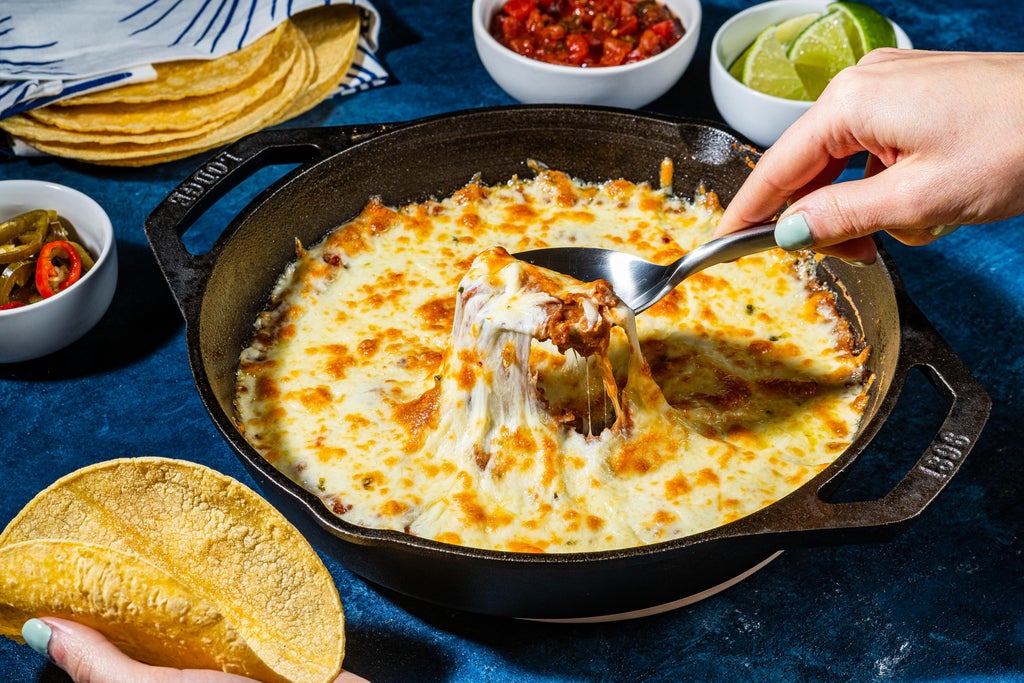Serve the skillet family-style, with the tortillas and your choice of garnishes, such as avocado, pico de gallo or salsa, sour cream, jalapeños, lime wedges and fresh coriander sprigs on the side.