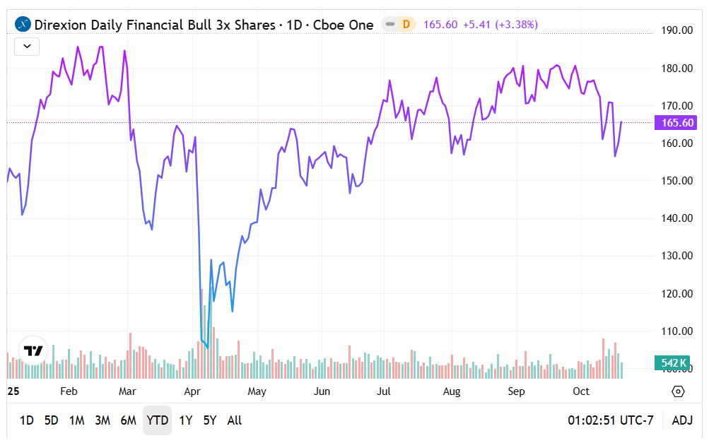 The FAS ETF: Since the start of the year, the FAS ETF has gained nearly 10%. In the trailing six months, the bull fund swung up almost 44%.