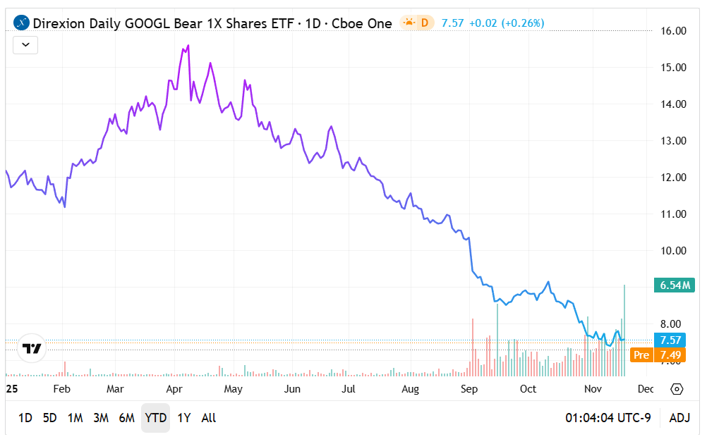 The GGLS ETF: Although a stronger relative performer, the GOOGL bear fund is also down for the year by a margin of 2.13%.