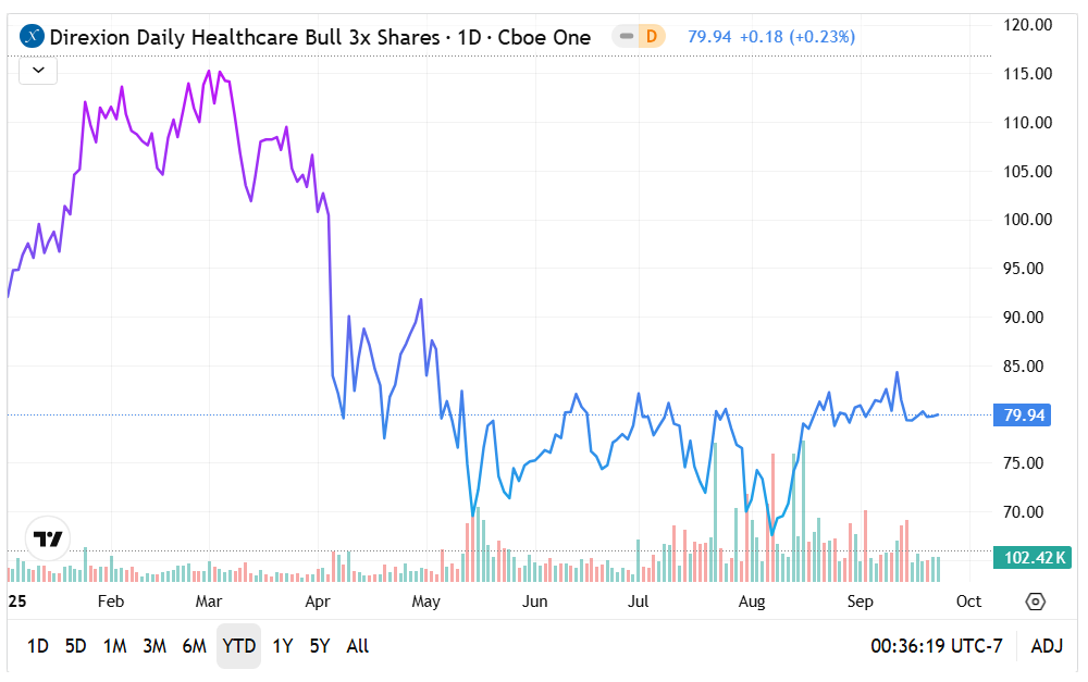The CURE ETF: Since the beginning of the year, the CURE ETF has lost a bit more than 13%, which isn't terrible considering the triple-leveraged structure. However, in the past 52 weeks, it's down over 40%.
