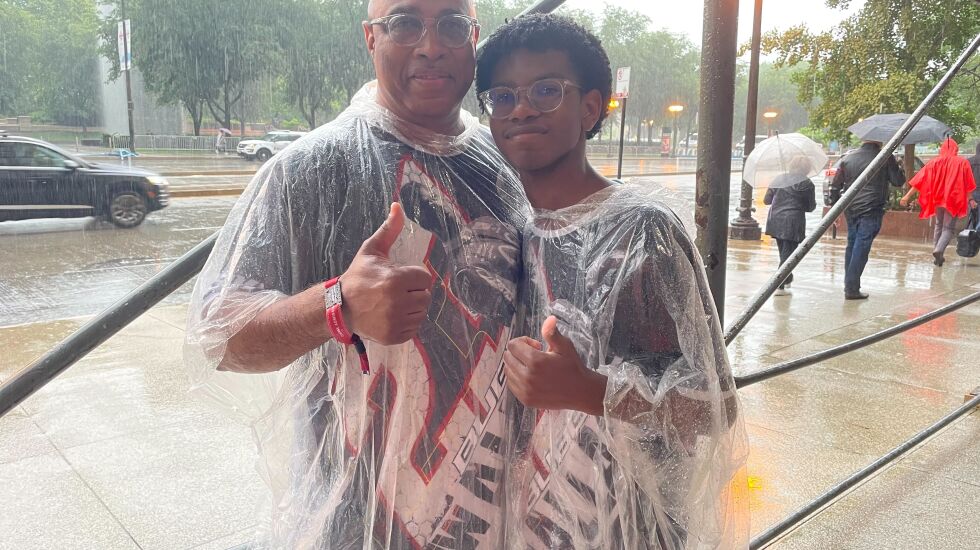 Ronald Jackson and his 14-year-old son, Josiah, drove from Portage, Indiana — “playing hooky” to experience their first-ever NASCAR event — and waited it out under scaffolding outside a Starbucks, with the teen passing the time by practicing photography and keeping his eyes peeled for Lamborghinis.