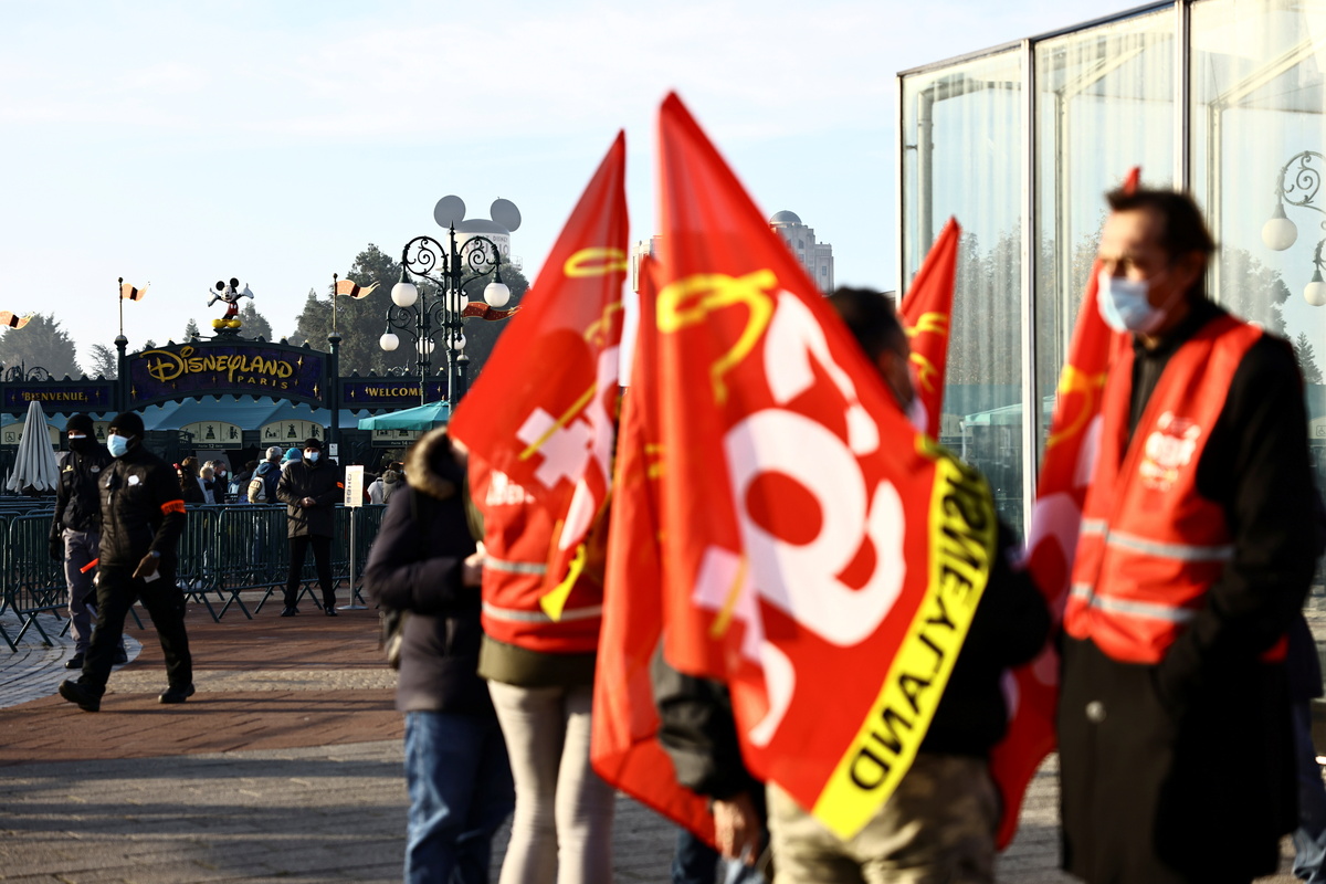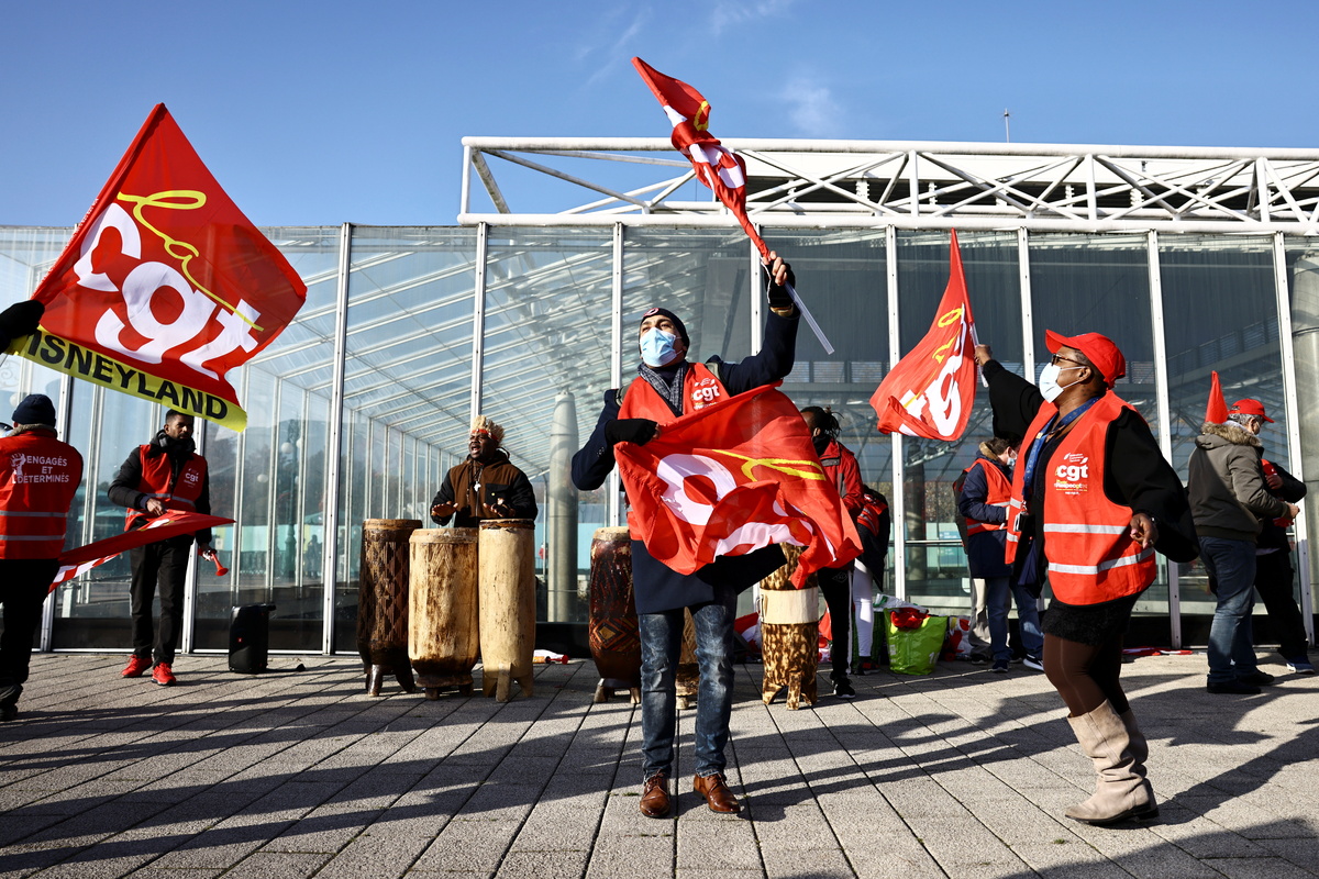 Visitors arriving at Mickey's enchanted kingdom streamed past several dozen staff belonging to the hard-left CGT trade union, who blew whistles and swayed to the tune of "Bella Ciao" as they protested against their working conditions.