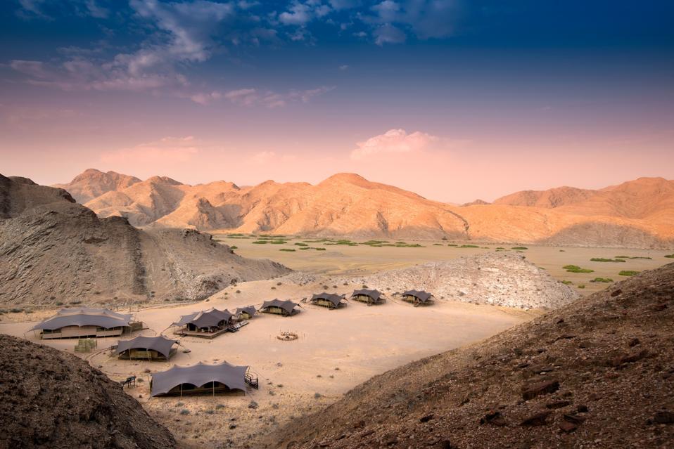 This little camp, which comprises just eight luxury tents, may be isolated, but the personal touches ensure you will be extremely comfortable, if not enrobed in luxury. In fact, this lodge offers a realistic safari experience with all the trimmings, making it ideal for the adventurous traveller who wishes to experience life in the wilds. Here, guests are immersed into the wilds and whilst the accommodation may be luxurious, it certainly matches the rugged landscape. Days are spent tracking endangered rhino, elephant and giraffe that have adapted to the desert conditions, as well as zebra, kudu and klipspringers. After a hearty meal enjoyed under the stars, it’s time to retire to your private veranda to marvel at the magnitude of your surroundings, with a refreshing drink in hand. The camp, which looks out on a rugged valley sloping down towards the Hoanib River, is completely solar-powered. Aside from excellent game viewing, guests can visit the local Giraffe Conservation Foundation, enjoy nature walks, track black rhino and get to meet people from the Himba and Herero tribes.