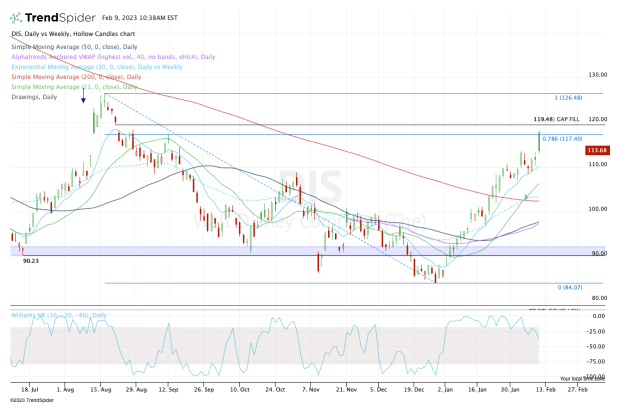 There we have the 78.6% retracement and gap-fill from August. That fade is neither a pro nor a con — simply an observation — but it’s not as if Disney stock is fading simply due to a lack of buyers. Instead, the fade comes from a key area on the chart.