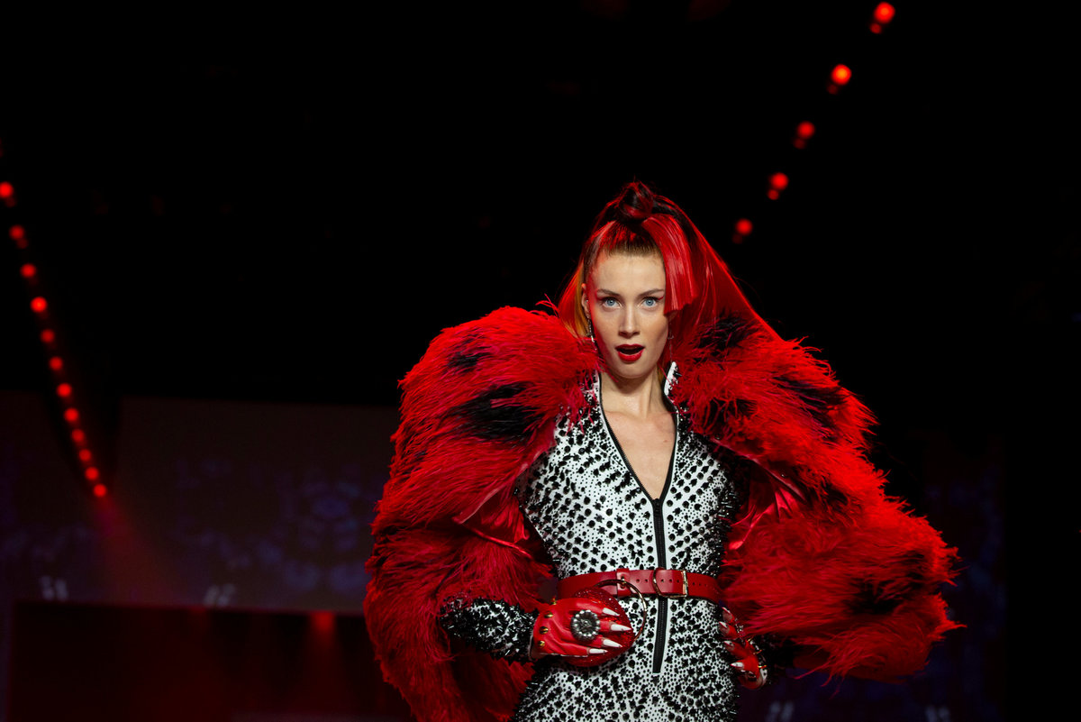 Models wore spike-heeled thigh-high latex boots, sculpted bustiers and corsets, while one cradled the unusual runway accessory of a tiny dog.