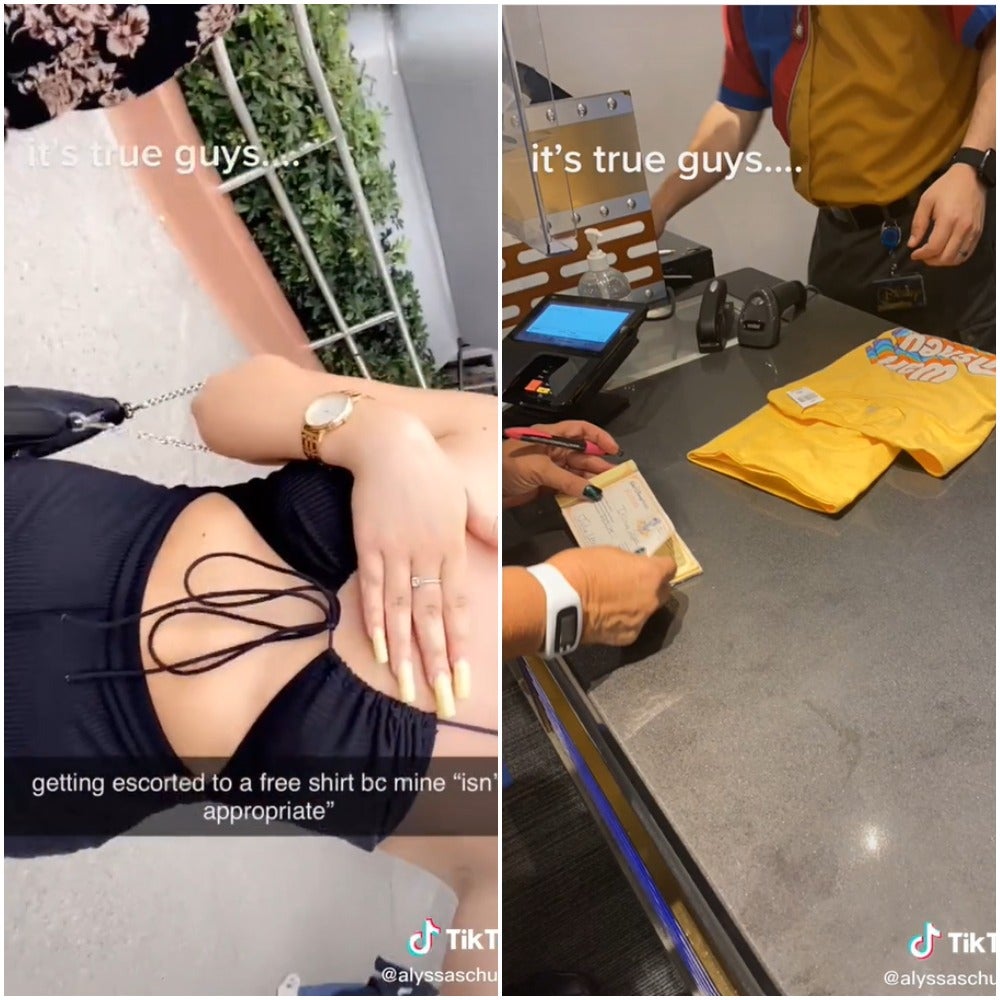 A caption can be seen in parts the video that says: “Getting escorted to a free t-shirt bc mine ‘isn’t appropriate.’”