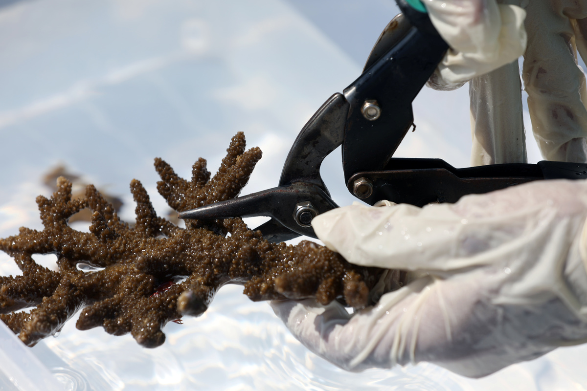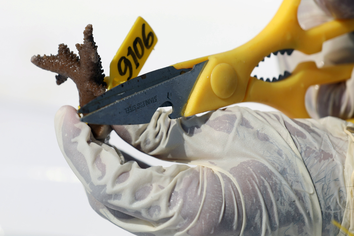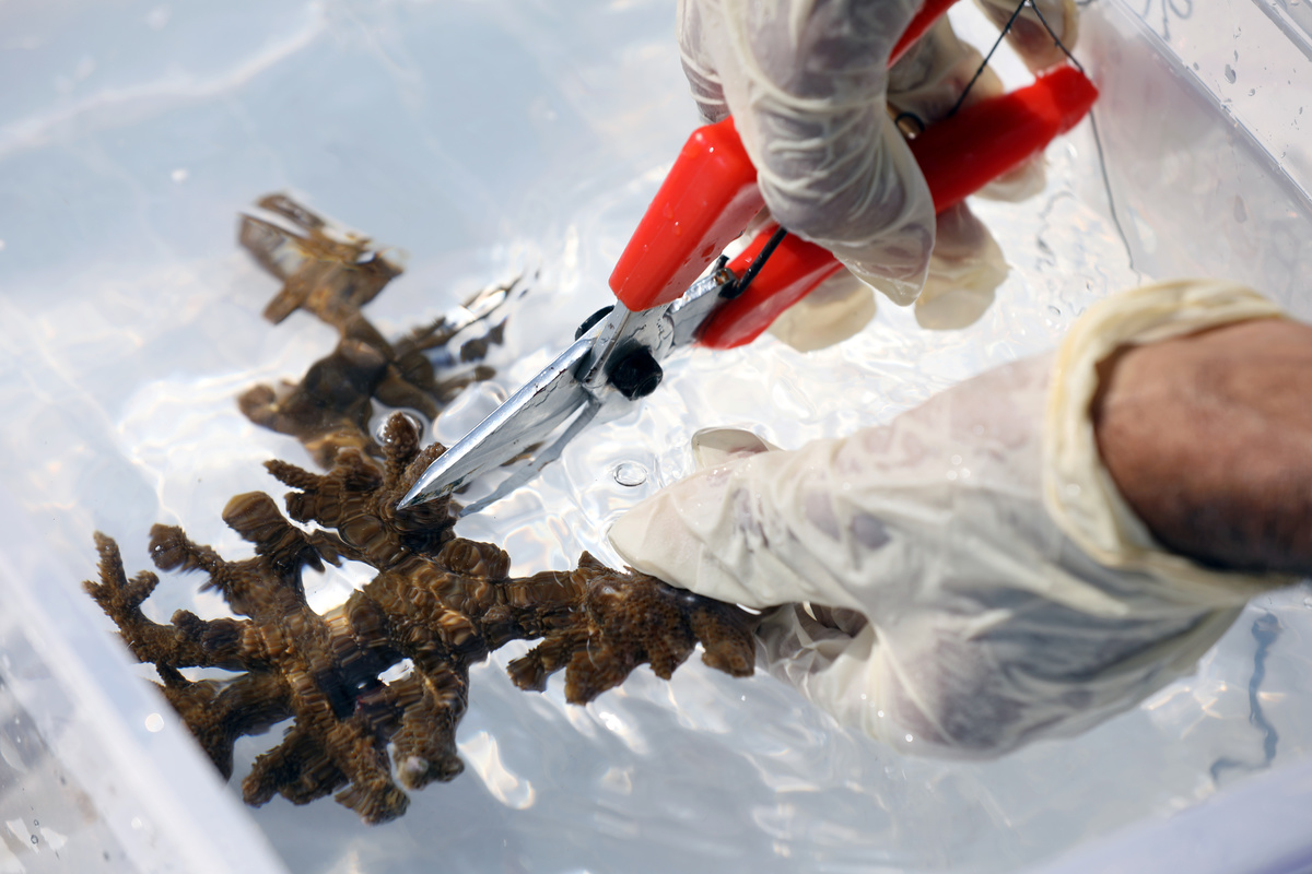 Off the east coast of the United Arab Emirates (UAE) coral freshly removed from a reef is cut into pieces and replanted by a group of divers in the waters below.