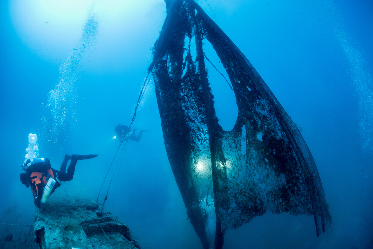 Lost fishing nets - known as "ghost nets" - wrapped around shipwrecks often turn into death traps for marine life.
