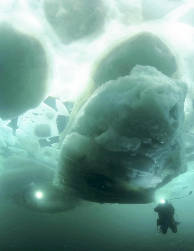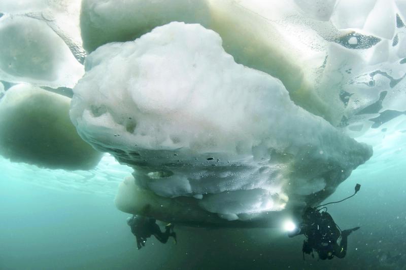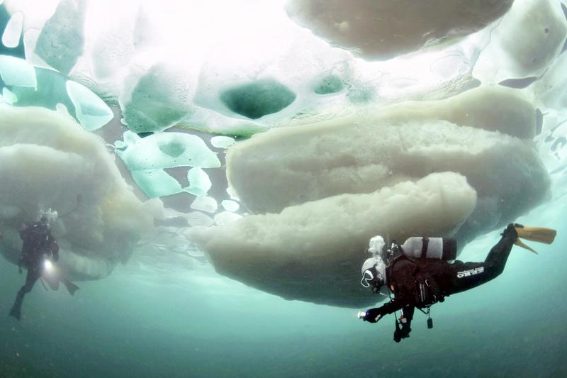 Divers swim in frigid water beneath drift ice in the Sea of Okhotsk off Shari, Hokkaido. The main season for diving beneath drift ice has arrived, with divers making holes in the frozen ocean surface to explore the huge chunks of ice from below. A 47-year-old diving instructor from Singapore said: "I can make out the shape of the drift ice more clearly from under water. There were also beautiful rays of light shining through the ice."