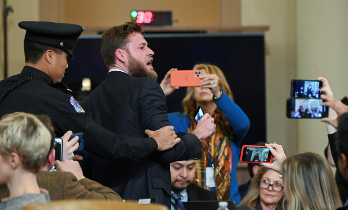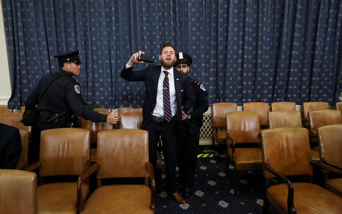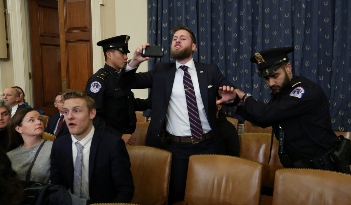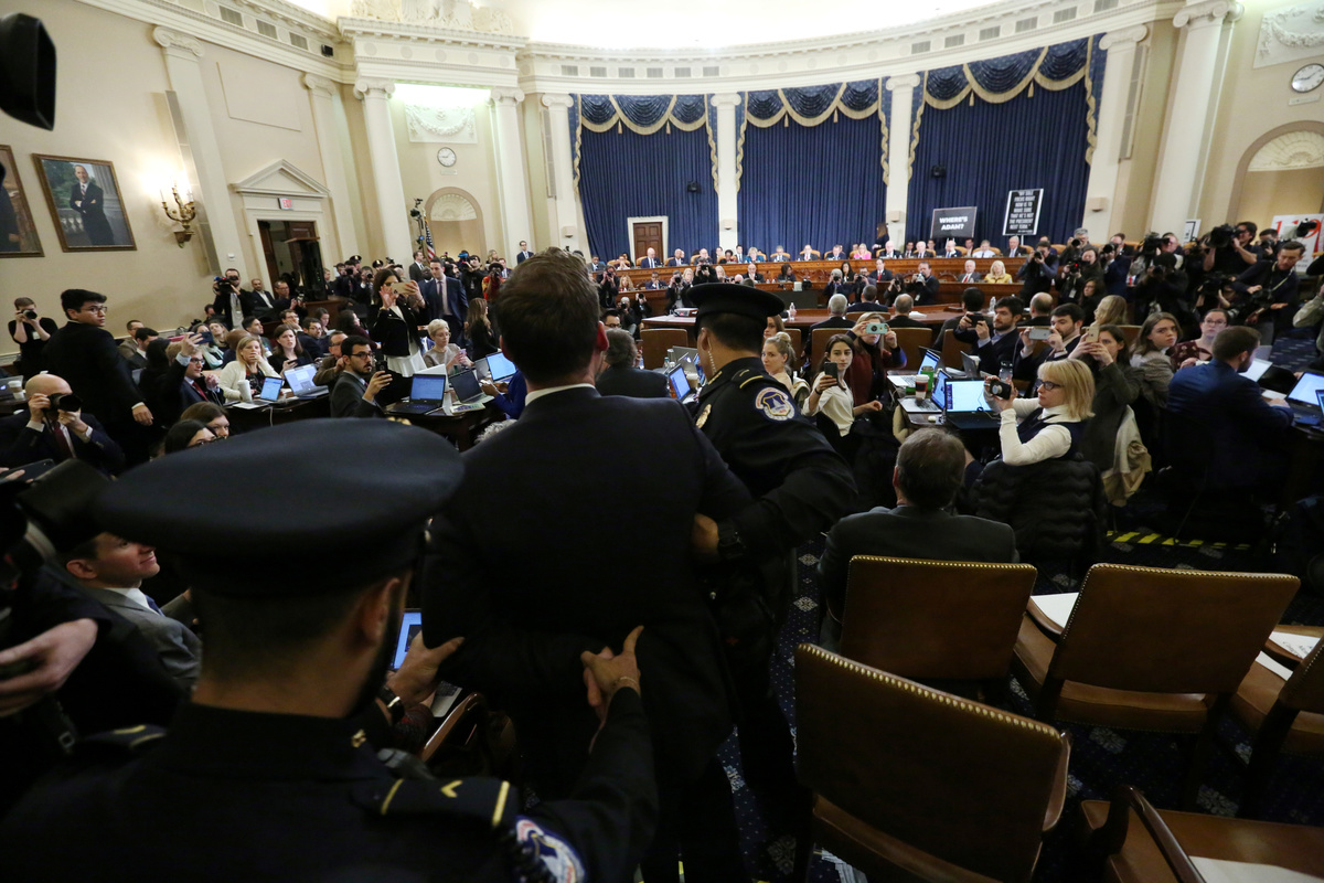 A supporter of U.S. President Donald Trump yells criticisms at U.S. House Judiciary Committee chairman Jerrold Nadler (D-NY) and is removed from the room by U.S. Capitol police as the committee begins an evidentiary hearing to receive counsel presentations of evidence from the impeachment inquiry into U.S. President Donald Trump on Capitol Hill in Washington, U.S., December 9, 2019. REUTERS/Jonathan Ernst/Pool