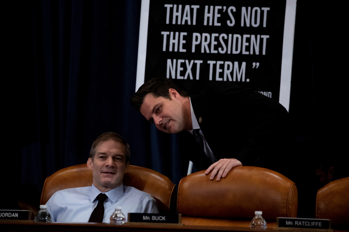 The U.S. House Judiciary Committee holds an evidentiary hearing to receive counsel presentations of evidence from the impeachment inquiry into U.S. President Donald Trump on Capitol Hill in Washington, U.S., December 9, 2019. REUTERS/Jonathan Ernst/PoolU.S. Rep. Jim Jordan (R-OH) and Rep. Matt Gaetz (R-FL) speak to one another during a public impeachment inquiry hearing with the House Judiciary Committee on Capitol Hill in Washington, D.C., U.S., December 9, 2019. Anna Moneymaker/Pool via REUTERS
