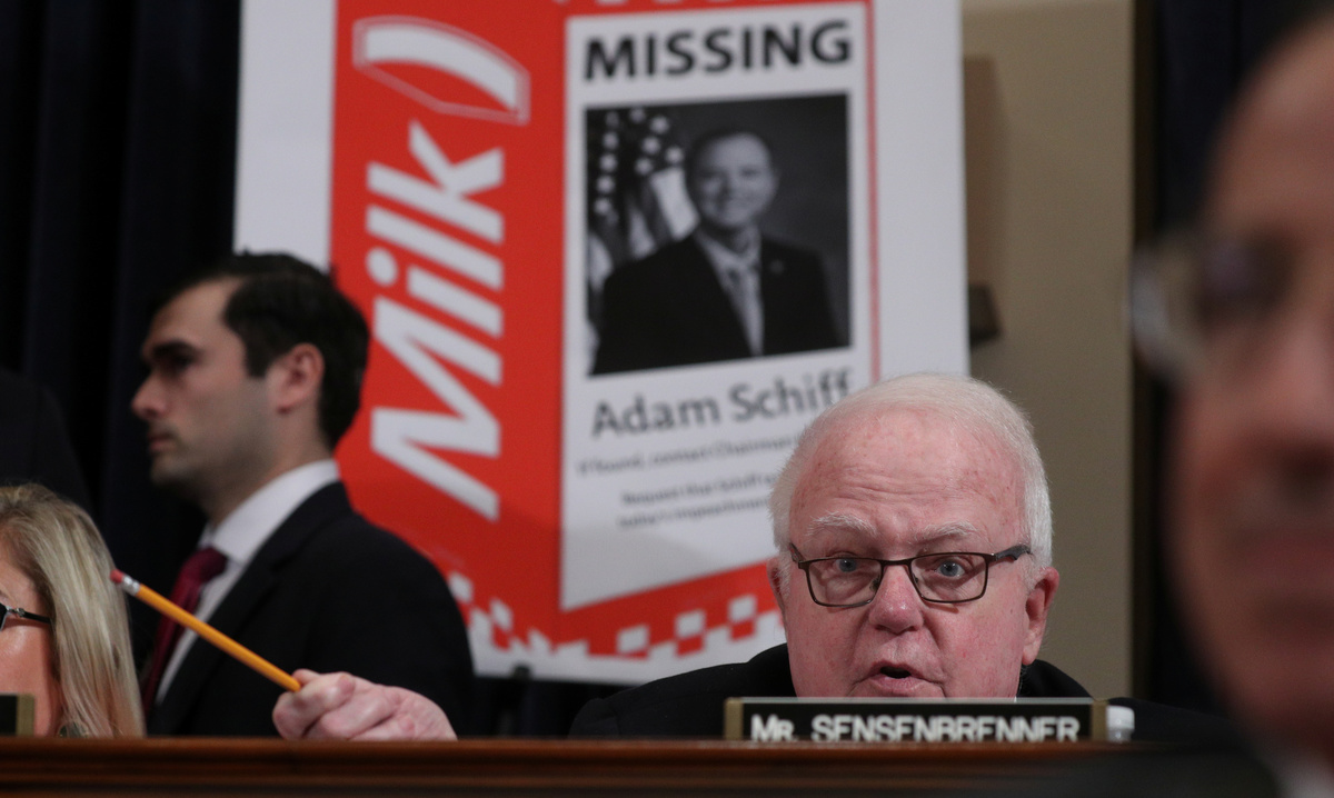 Rep. Jim Sensenbrenner (R-WI) challenges House Judiciary Committee Chairman Jerrold Nadler (D-NY) with a point of order as Sensenbrenner sits in front of a Republican prop showing an image of House Intelligence Committee Chairman Adam Schiff on a milk carton during a committee hearing to receive counsel presentations of evidence on the impeachment inquiry into U.S. President Donald Trump on Capitol Hill in Washington, U.S., December 9, 2019. REUTERS/Loren Elliott