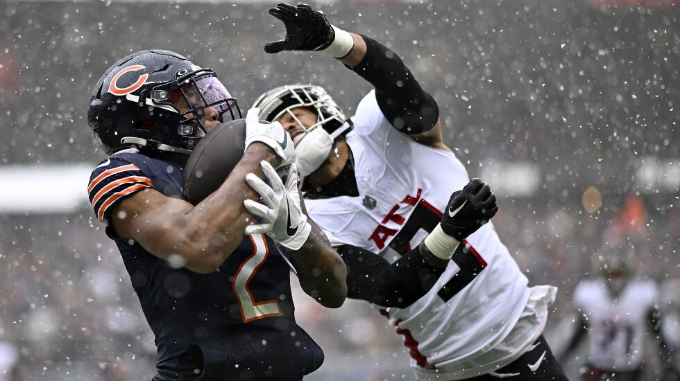 But even Moore admitted his over-the-shoulder catch for a 32-yard gain in the Bears’ 37-17 victory over the Falcons on a snowy Sunday at Soldier Field was difficult even for him. Running full speed down the left sideline against Falcons cornerback AJ. Terrell, Moore initially looked back toward quarterback Justin Fields, then had to twist his head to his left and look skyward to find the ball — and make a bread-basket catch as he headed out of bounds at the Falcons’ 33-yard line.