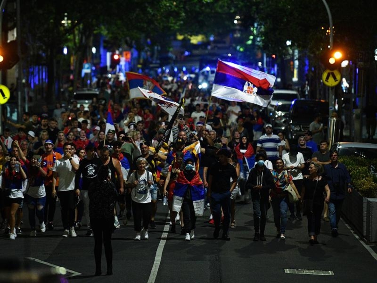 The crowd, some waving Serbian and Greek flags, surrounded police while chanting "Novak", before fans were pepper sprayed by the officers.