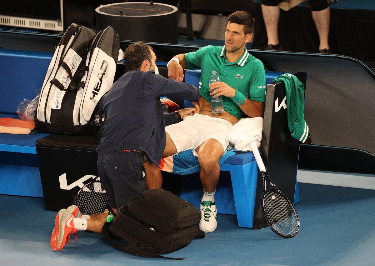 Djokovic disappeared off Rod Laver Arena for treatment and needed further attention during the third set.